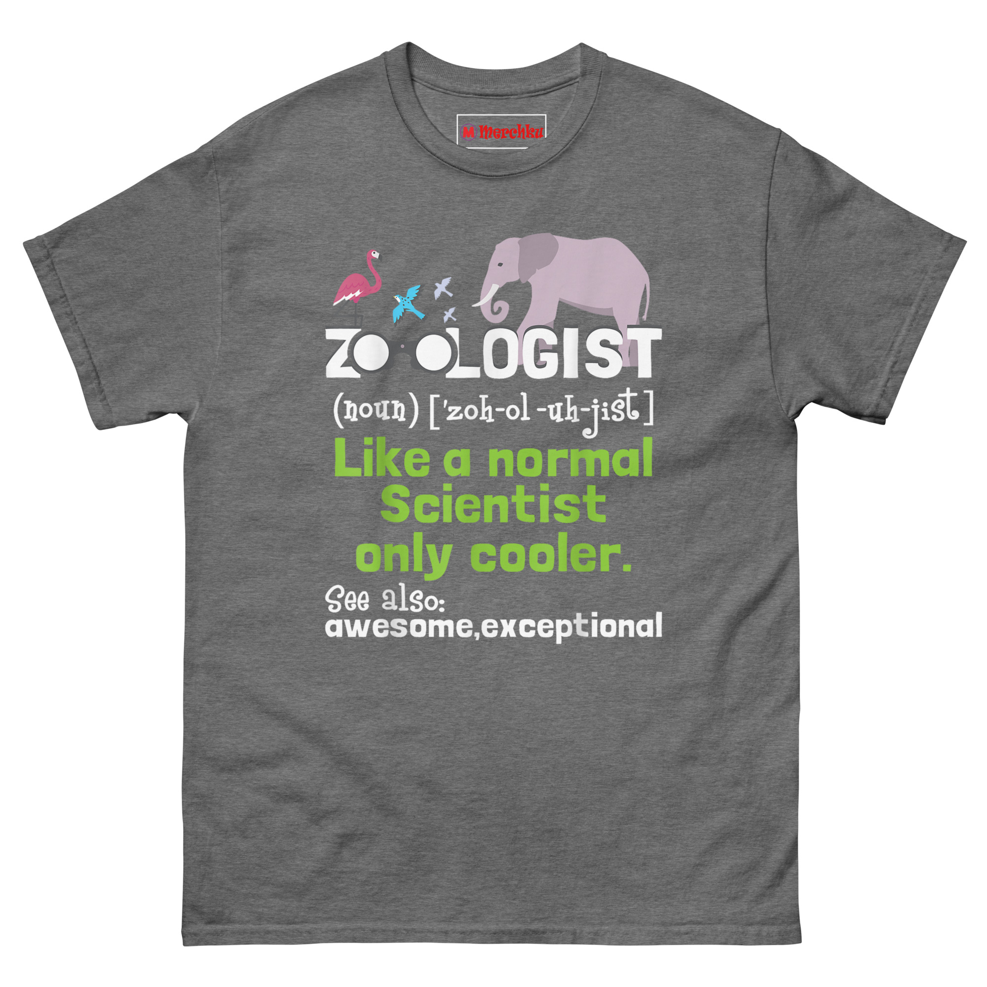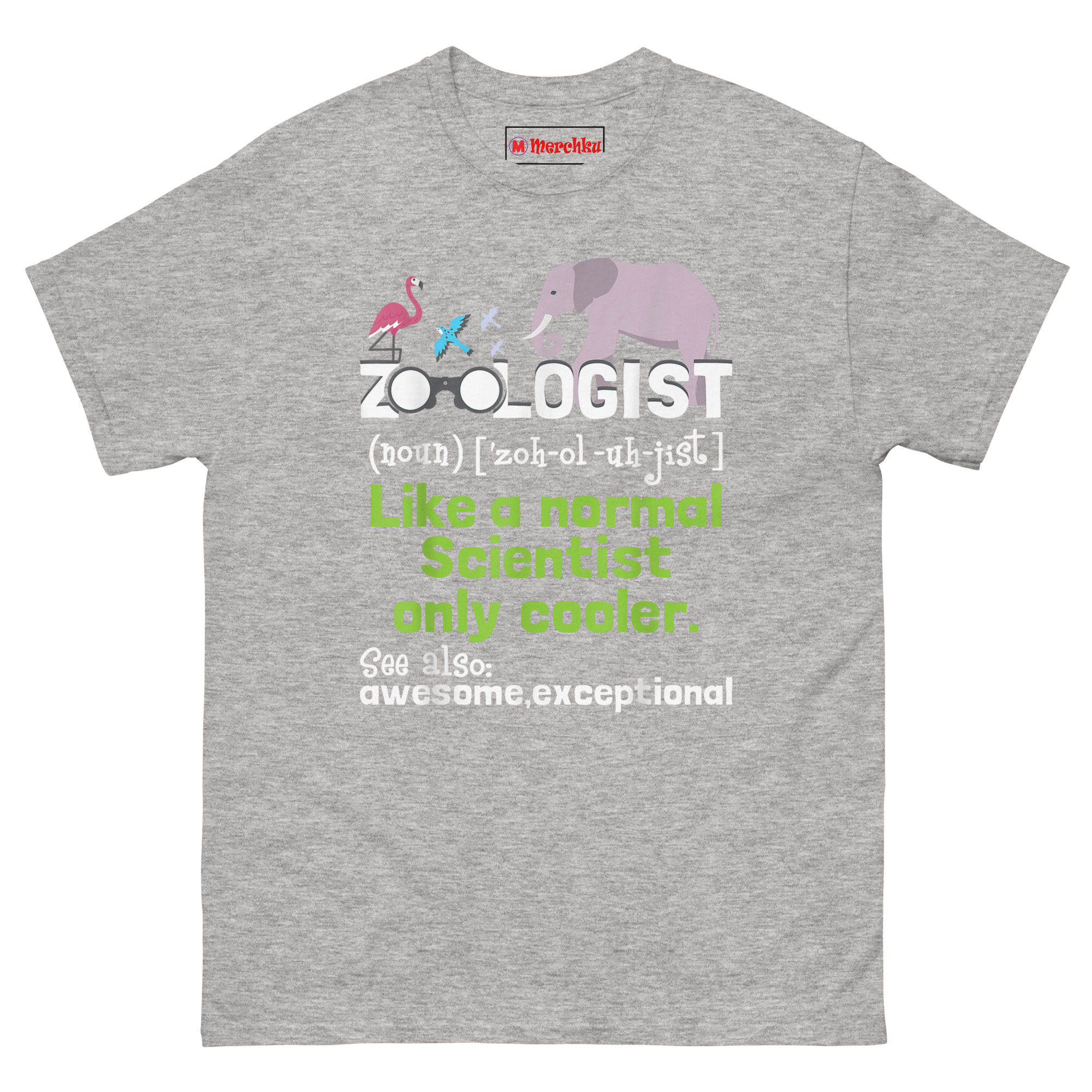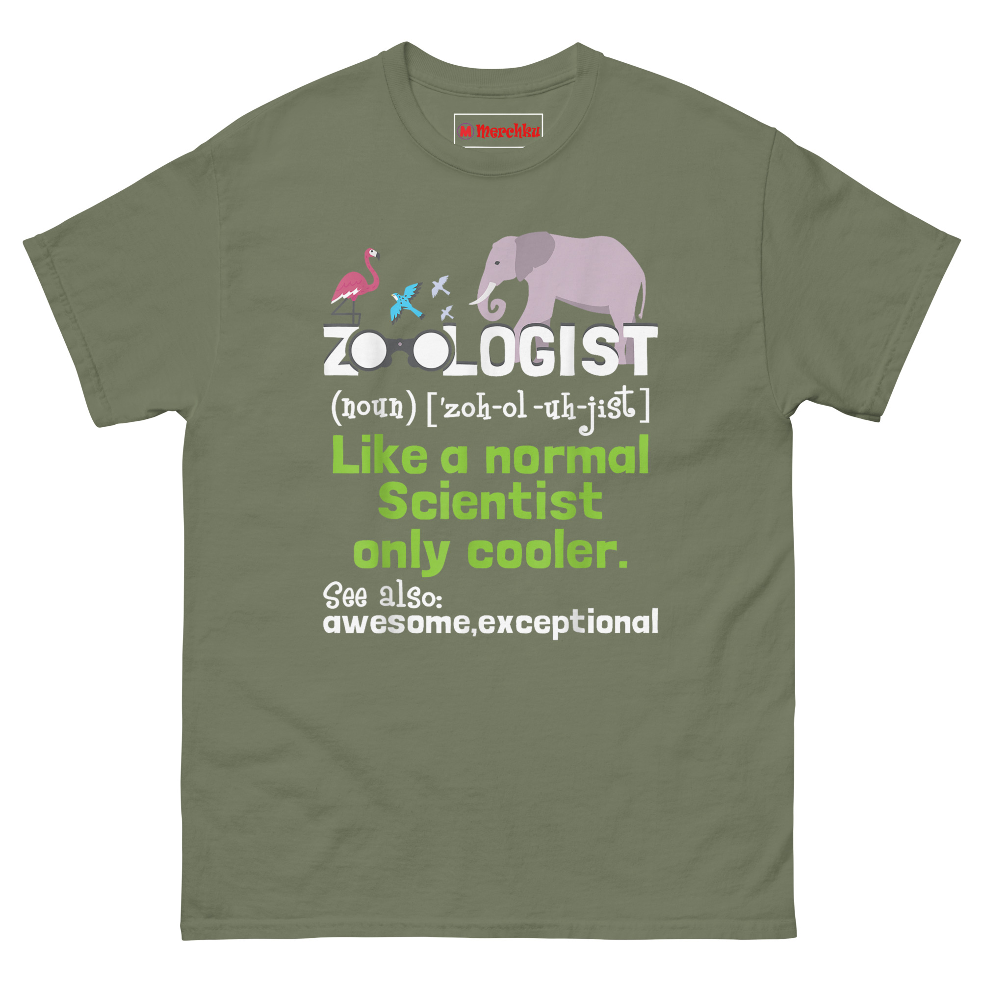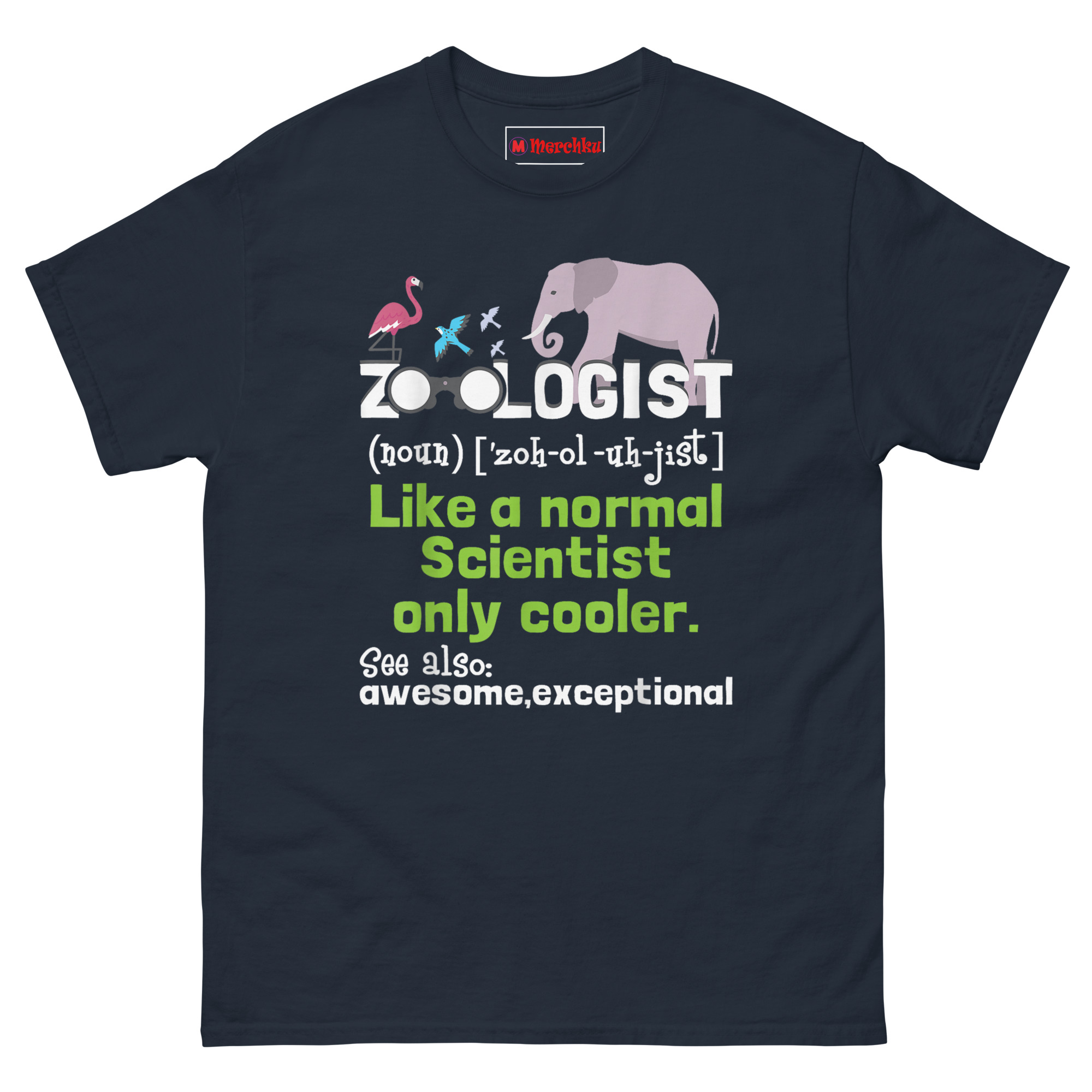 That conversation became the foundation for this design. We wanted something that looked official, like it was ripped straight from a dictionary, but delivered a wink at the end. The flamingo, songbirds, and elephant at the top establish the animal theme immediately. Replacing the O’s in “ZOOLOGIST” with binoculars? That’s intentional. Observation drives everything in this field. The green text delivers the punchline, and the “See also” section at the bottom wraps it with two words every professional deserves to hear. Whether you’re a Wildlife biologist apparel enthusiast or a student pulling all-nighters in the zoology department, this shirt validates your career choice while making people smile.