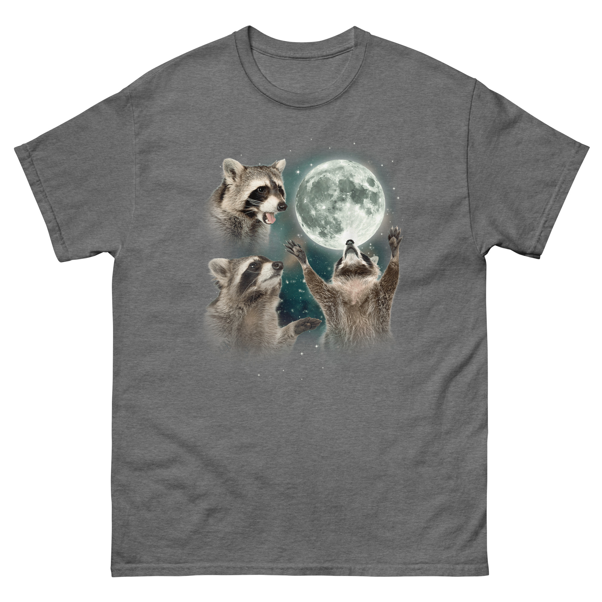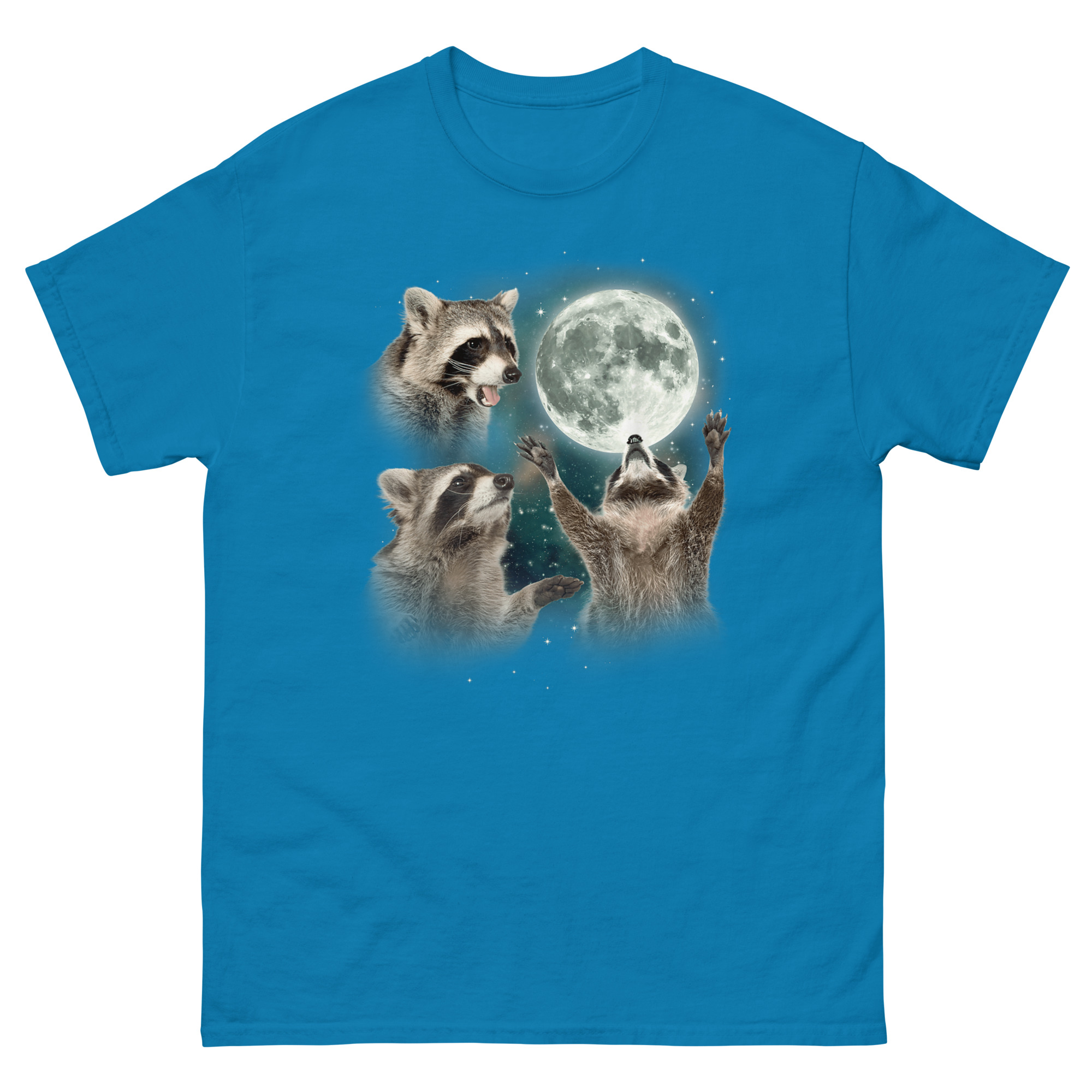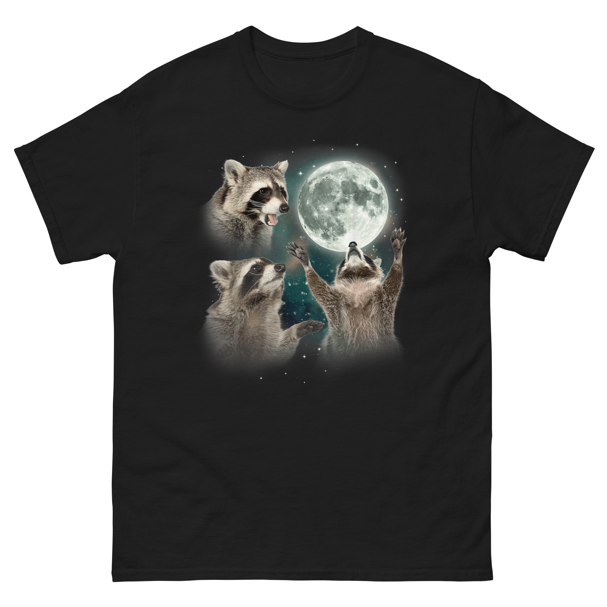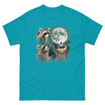 That moment stuck with me because raccoons get a bad rap. People call them pests, trash pandas, nuisances. But honestly, they are survivors. They adapt, they thrive, and they move through the night with this weird confidence. So we decided to give one the full wolf moon treatment. You know the look, three wolves, full moon, cosmic background, total dominance. Except we swapped the wolves for raccoons. Now you have one raccoon mid-howl in profile, another staring dramatically into the distance, and the central figure raising its tiny paws toward the lunar orb like it is commanding the night itself. The background swirls with teal and violet nebula clouds, sprinkled with stars. It is a three raccoon moon parody shirt that takes itself just seriously enough to be hilarious.