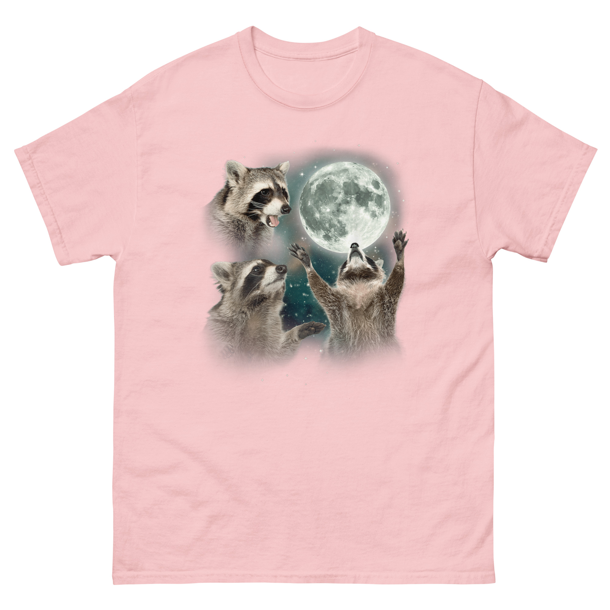 Check out the Raccoon Howling T Shirt, a piece of majestic kitsch animal apparel that gives the humble trash panda the epic fantasy treatment it never asked for. It features three realistic raccoons in dramatic poses around a glowing full moon against a cosmic nebula background. This shirt is built for anyone who appreciates surreal wildlife graphic tees and the beautiful absurdity of treating dumpster divers like forest kings.