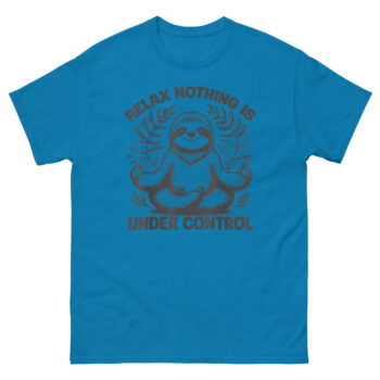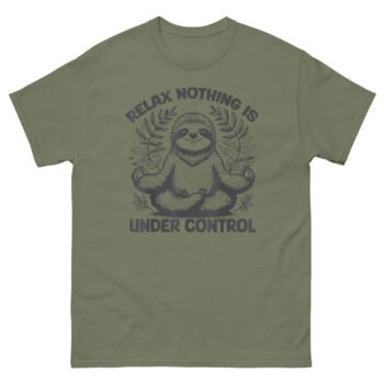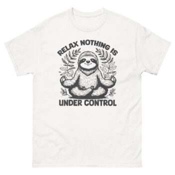 This Relax Nothing is Under Control T Shirt design came from watching someone try too hard to relax. There’s a certain irony in people who stress about whether they’re meditating correctly or doing yoga poses perfectly. Meanwhile, the sloth, nature’s most relaxed creature, just hangs there, completely unbothered. We wanted to capture that energy. The illustration features a sloth in a classic lotus pose, eyes closed in a peaceful smile, hands forming the Gyan Mudra. It’s framed by intricate, hand-drawn tropical leaves that give it an organic, earthy feel. Above the sloth, “RELAX” arches boldly, followed by “NOTHING IS” flanking the head, and finally “UNDER CONTROL” anchors the bottom. It’s a visual koan: the highest form of relaxation isn’t controlling the chaos, it’s realizing you can’t, and being okay with it anyway.