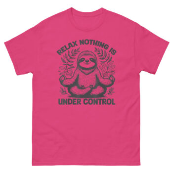 This Relax Nothing is Under Control T Shirt design came from watching someone try too hard to relax. There’s a certain irony in people who stress about whether they’re meditating correctly or doing yoga poses perfectly. Meanwhile, the sloth, nature’s most relaxed creature, just hangs there, completely unbothered. We wanted to capture that energy. The illustration features a sloth in a classic lotus pose, eyes closed in a peaceful smile, hands forming the Gyan Mudra. It’s framed by intricate, hand-drawn tropical leaves that give it an organic, earthy feel. Above the sloth, “RELAX” arches boldly, followed by “NOTHING IS” flanking the head, and finally “UNDER CONTROL” anchors the bottom. It’s a visual koan: the highest form of relaxation isn’t controlling the chaos, it’s realizing you can’t, and being okay with it anyway.