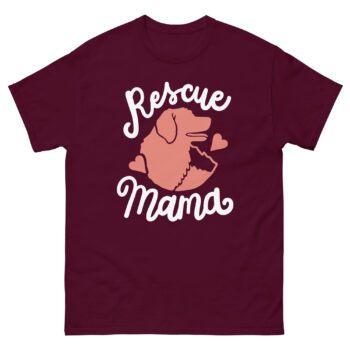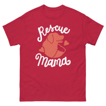 The dog rescue mama shirt with heart design features a charming dog silhouette surrounded by hearts and elegant script that reads “Rescue Mama.” It’s subtle yet powerful, making it ideal for:
