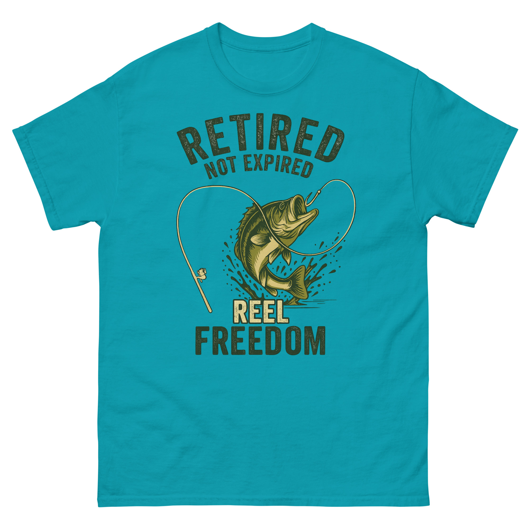Firstly, the central jumping fish graphic symbolizes that vibrant, active spirit. It’s about that heart-pounding moment of a successful strike. Secondly, the playful “Reel Freedom” pun perfectly merges the beloved hobby of rod and reel fishing with the ultimate goal of retirement: true liberation. Finally, the bold “Retired Not Expired” text across the top serves as your personal motto. It’s a conversation starter that speaks of resilience and a life fully lived.