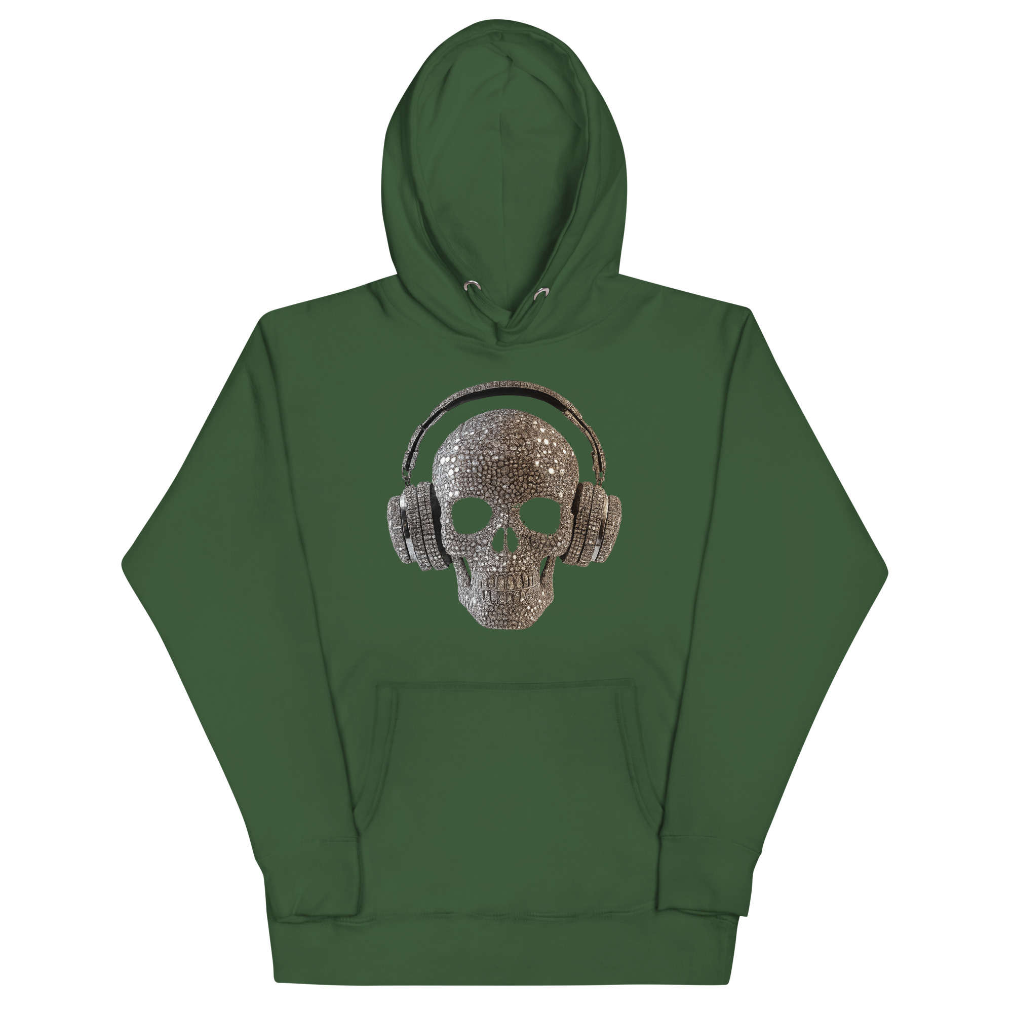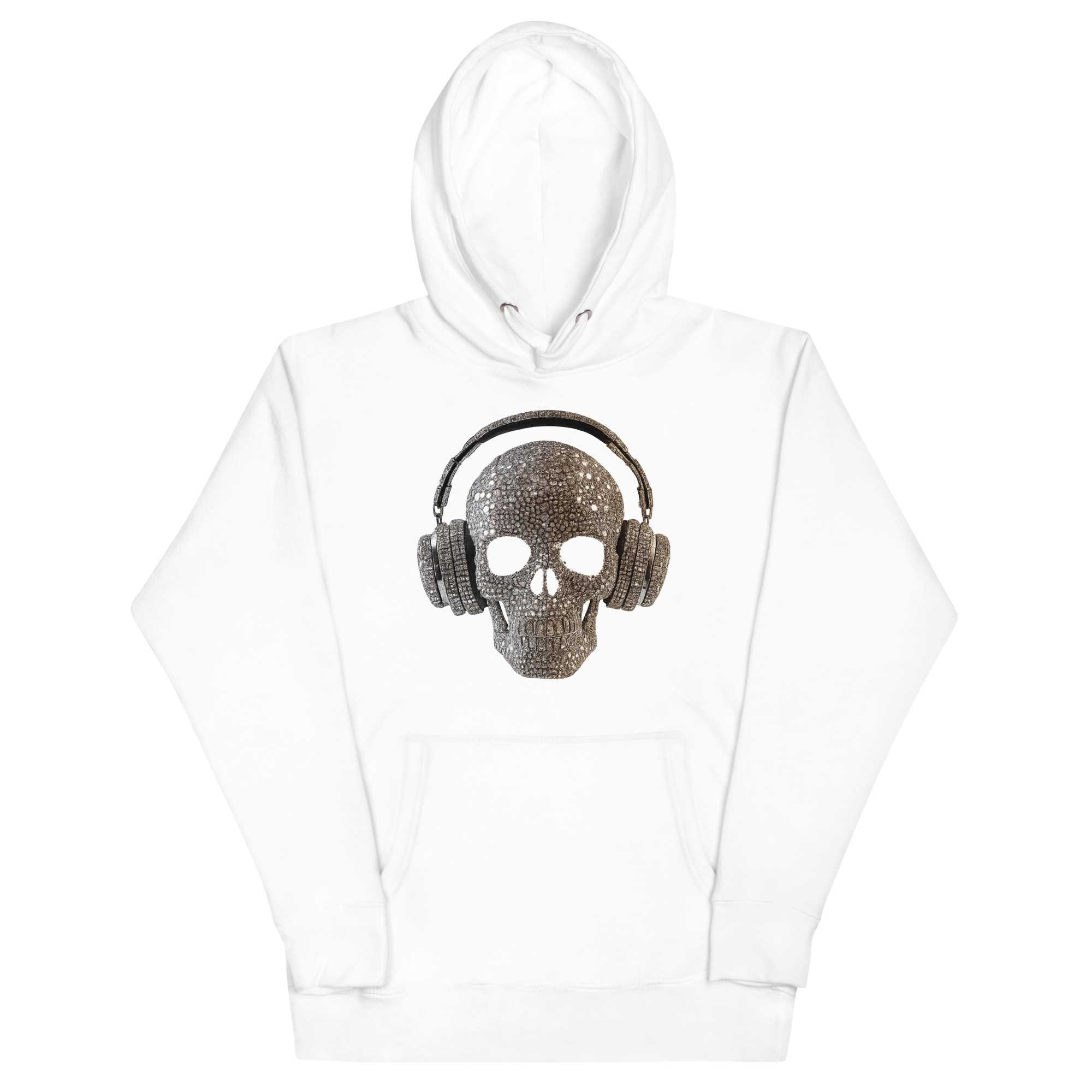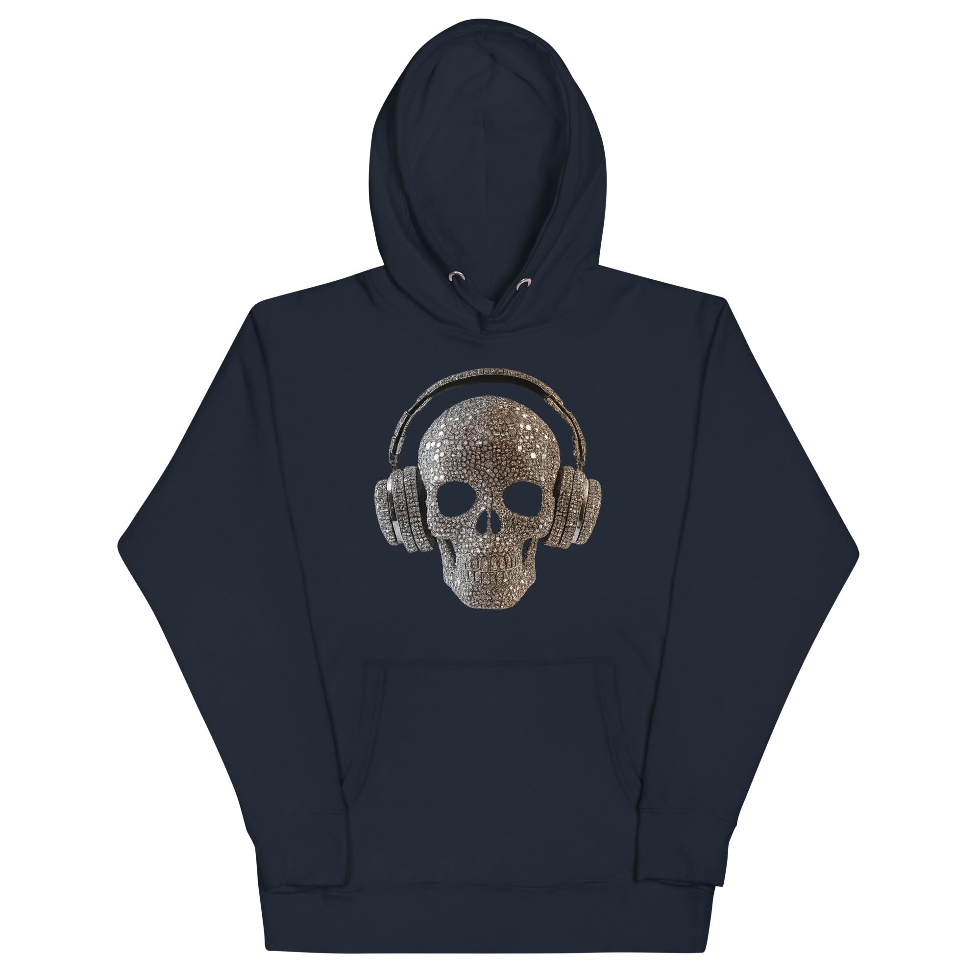 Let your eyes settle on the centerpiece. Against a soft, matte black background, a detailed skull wearing headphones comes to life. However, it doesn’t look flat or painted on. Instead, our special printing technique creates a mosaic texture that mimics real, faceted gems.