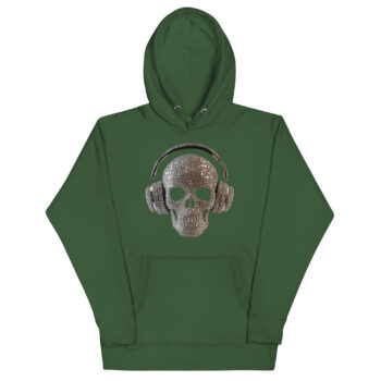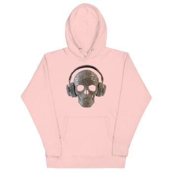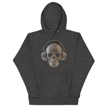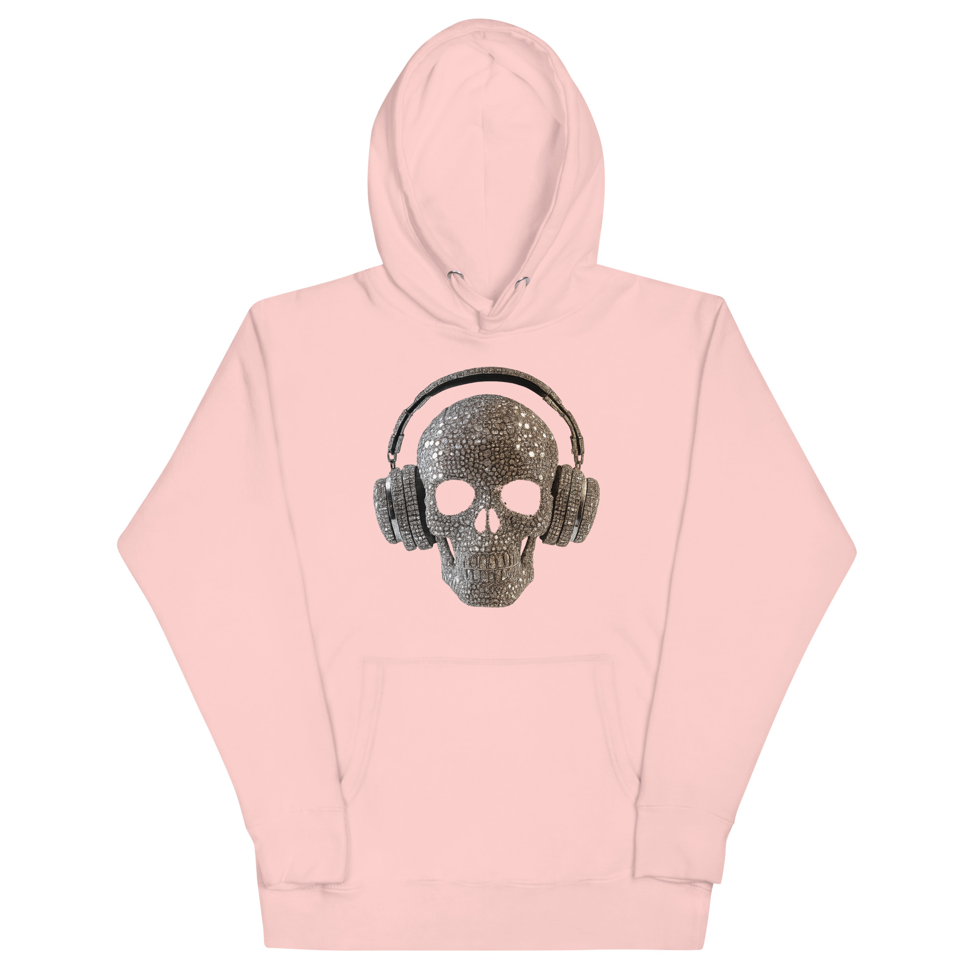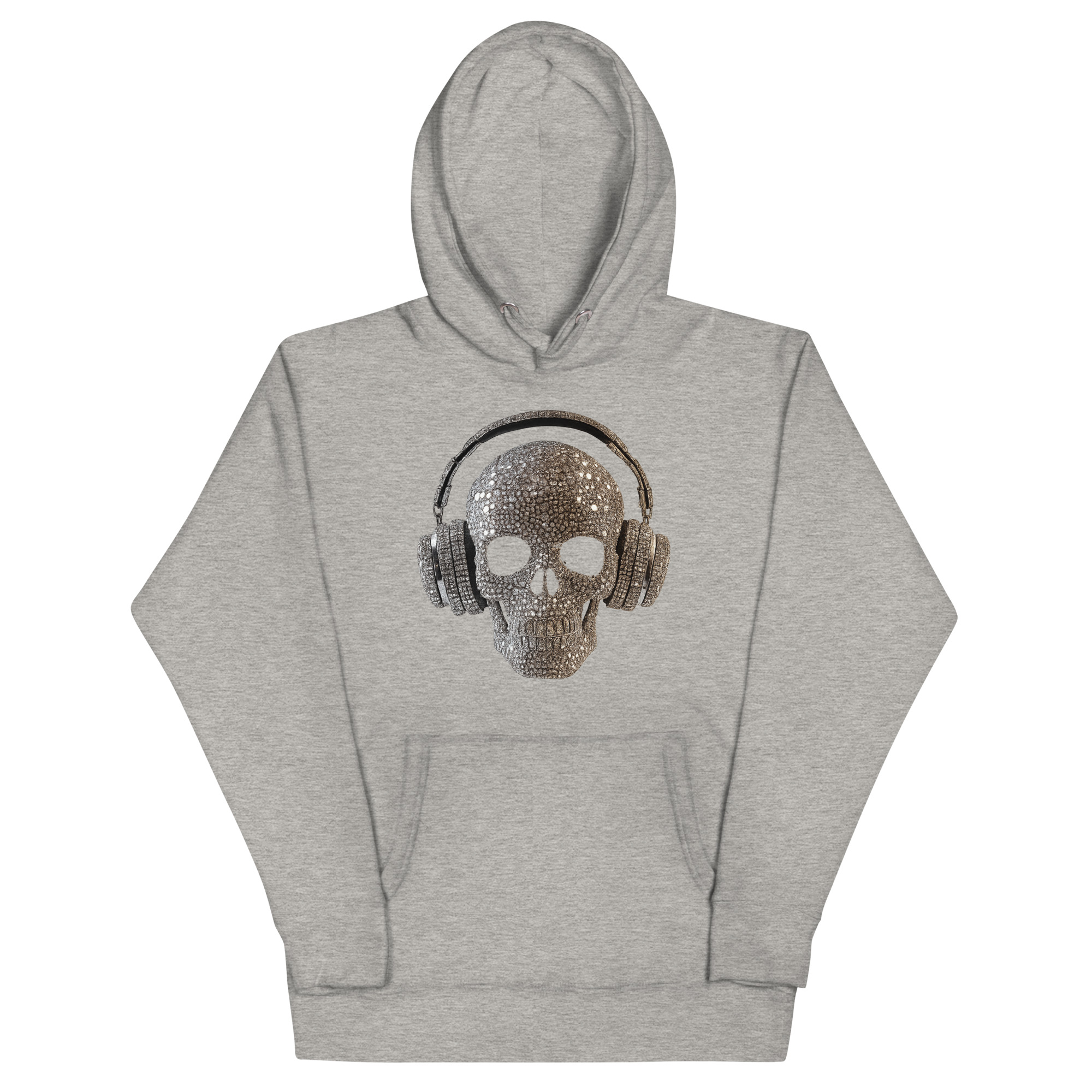 Let your eyes settle on the centerpiece. Against a soft, matte black background, a detailed skull wearing headphones comes to life. However, it doesn’t look flat or painted on. Instead, our special printing technique creates a mosaic texture that mimics real, faceted gems.