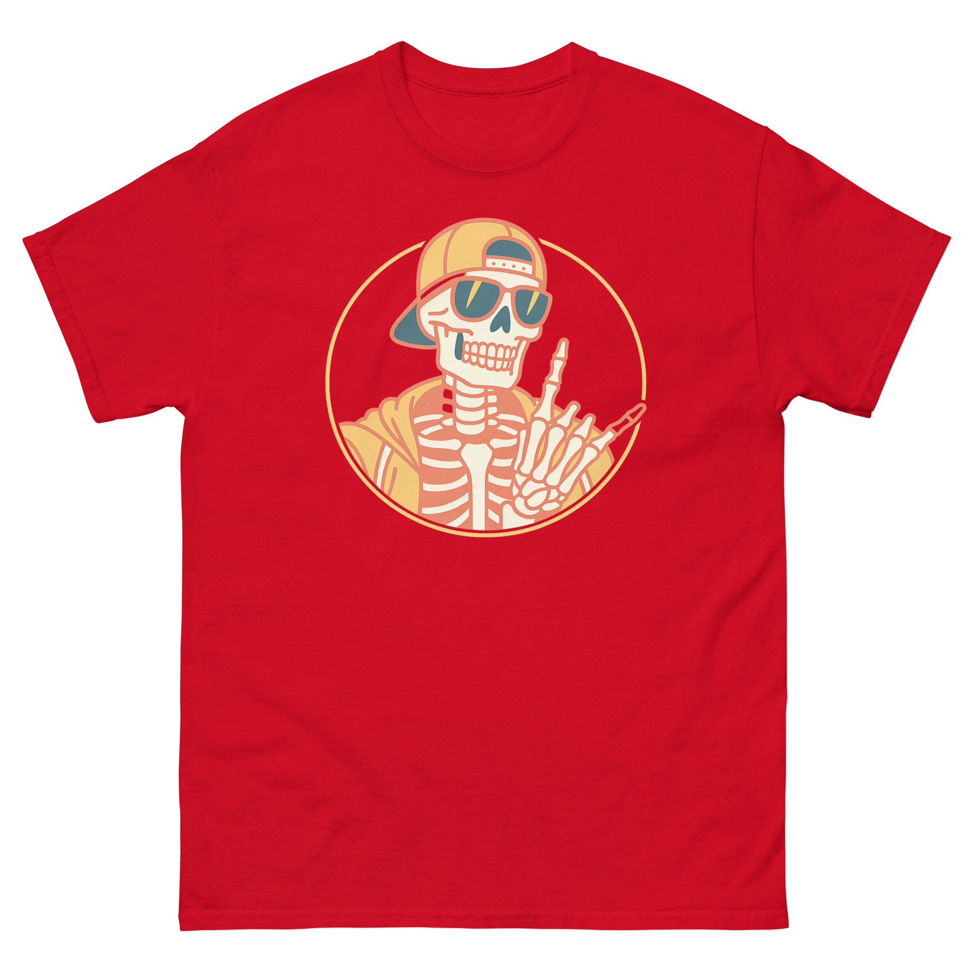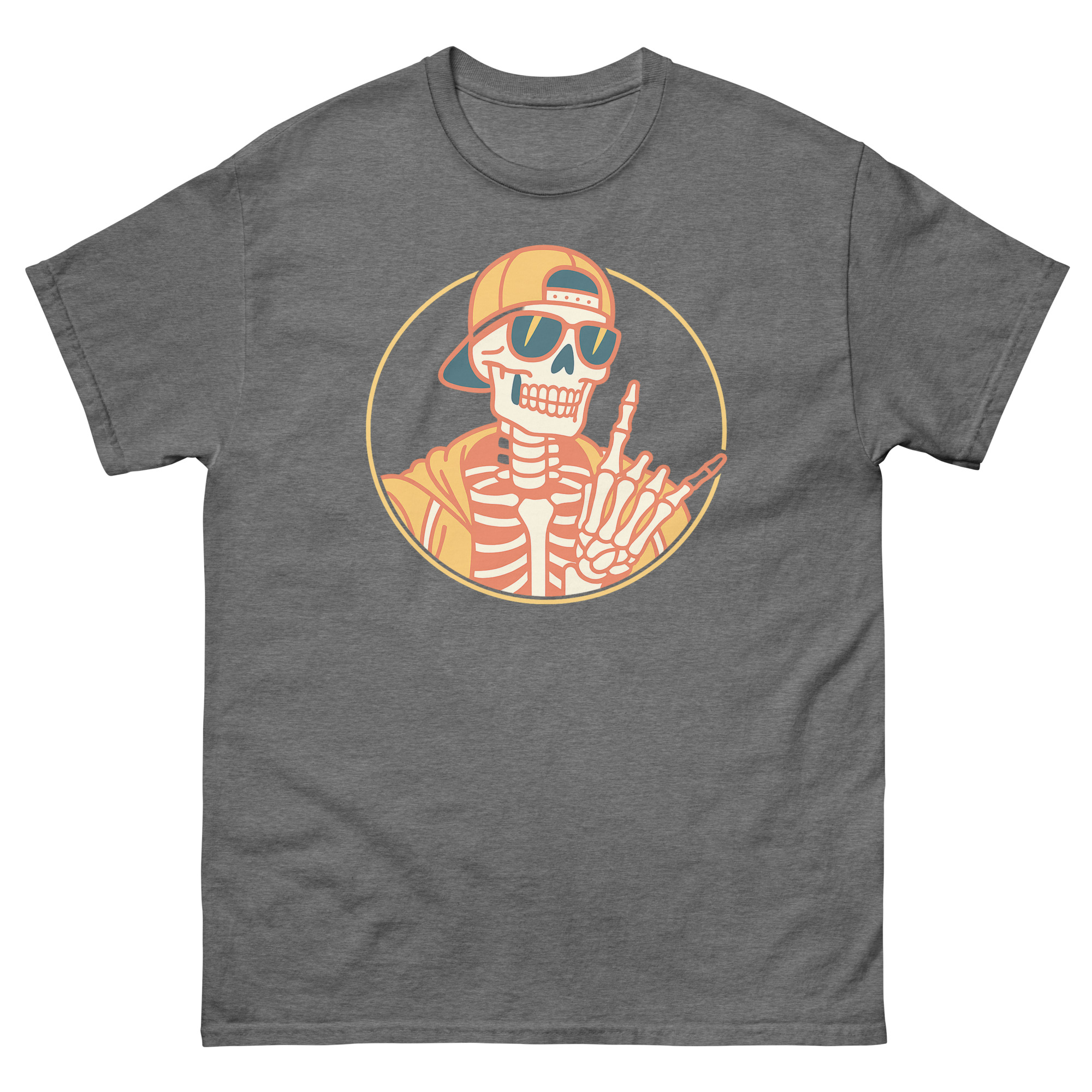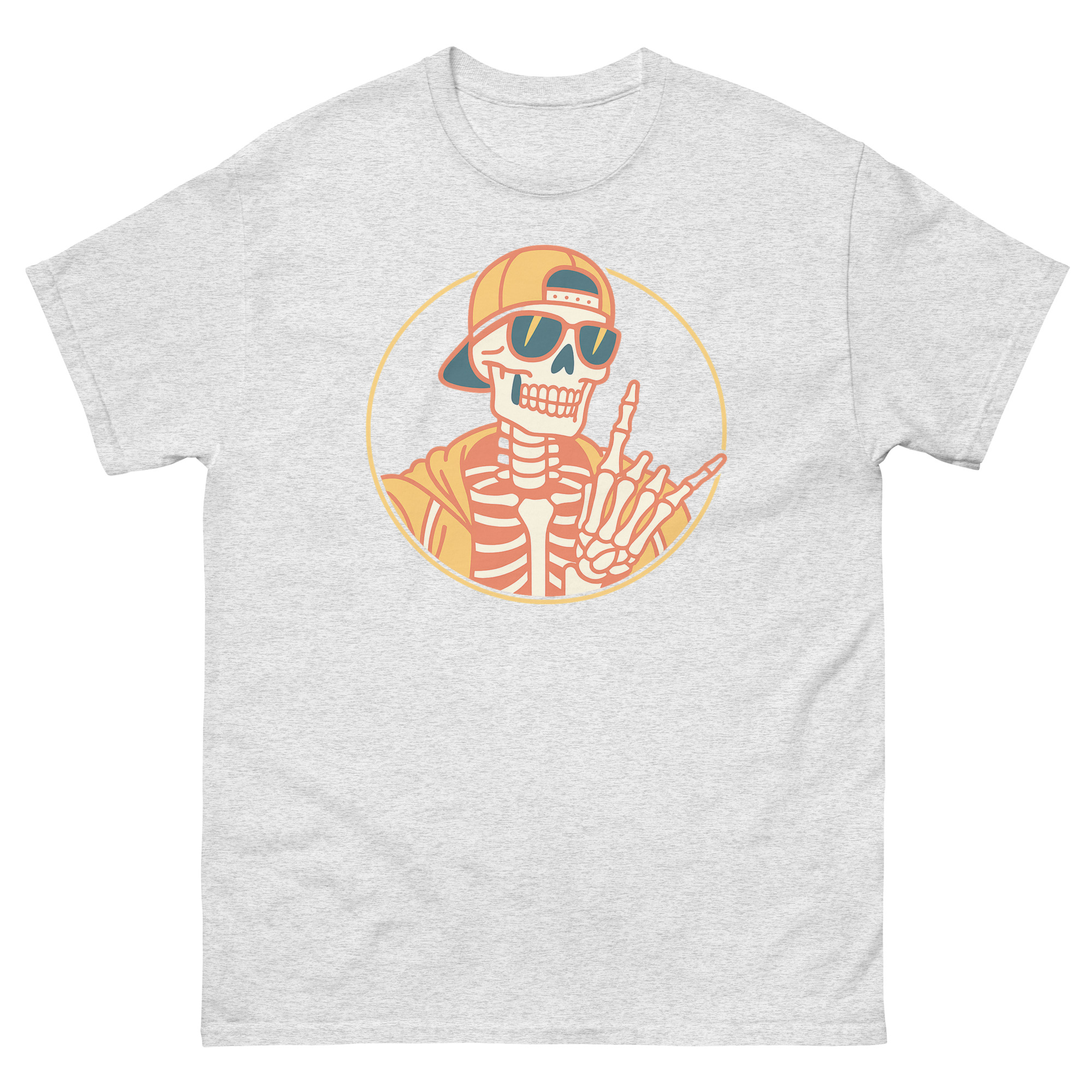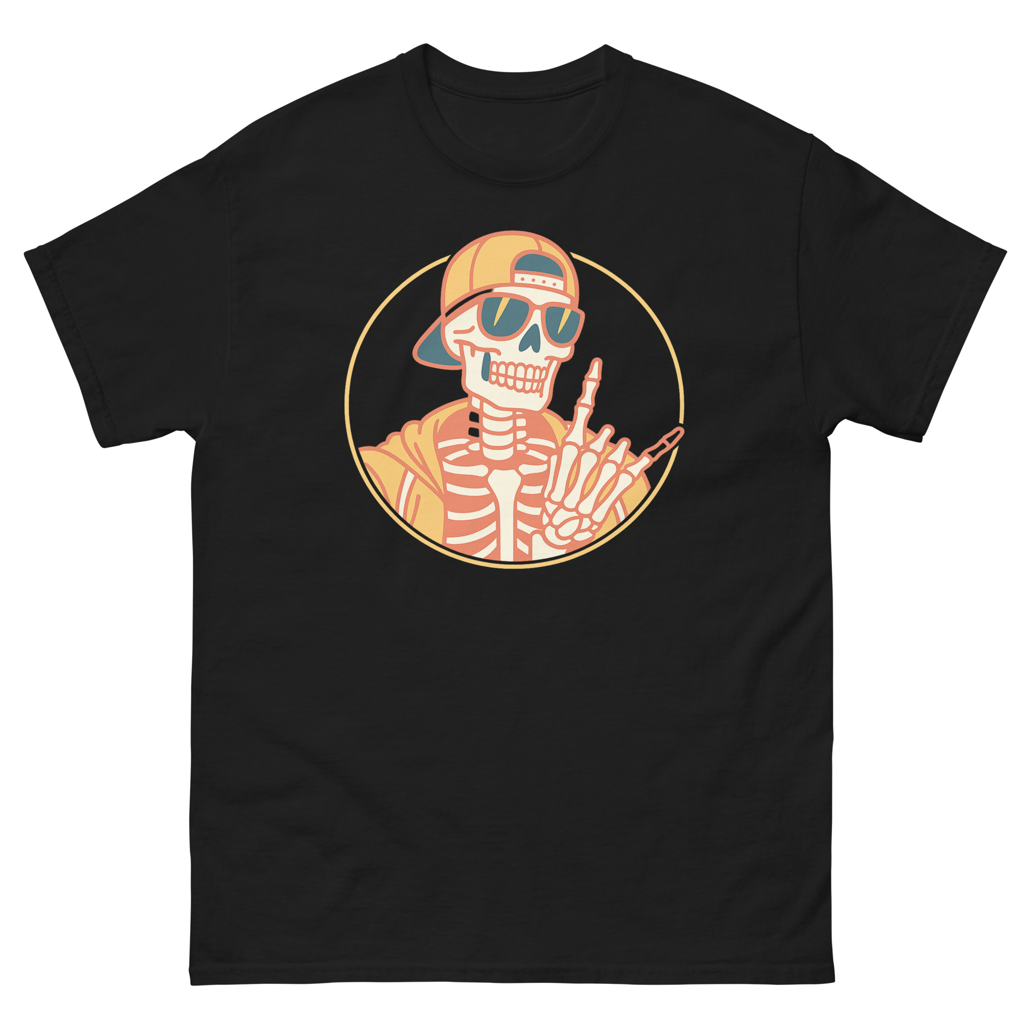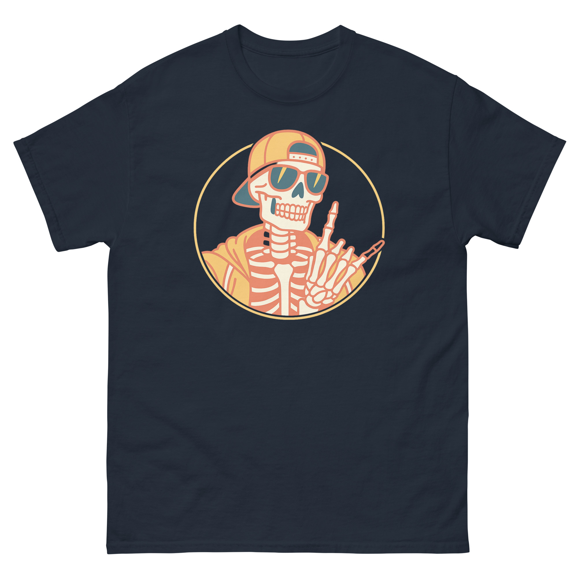 The main graphic features a skeleton, the ultimate symbol of raw truth, totally rocking out. He’s wearing a backwards baseball cap and slick sunglasses, instantly giving off a vibe of cool confidence. Then, there’s the gesture—a raised middle finger. This isn’t just for shock value; it’s a classic symbol of defiance found throughout rock history. It’s a bold, fun way to say you play by your own rules.