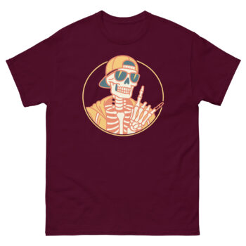 Printing: We use advanced Direct-to-Garment (DTG) printing. This method injects the ink directly into the shirt’s fibers, making the design vibrant and incredibly durable. Consequently, the skeleton hand rock gesture will stay sharp and bright, wash after wash.