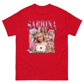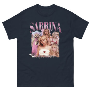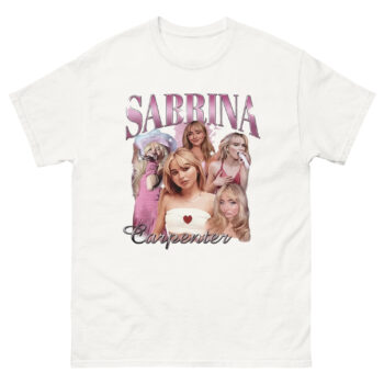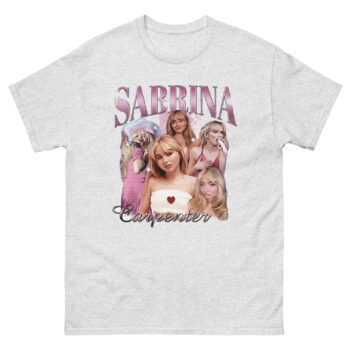 Above the photos, the name “SABRINA” appears in big, bold, pink letters. This fun, retro font adds a splash of energy and femininity. Below the collage, the name “Carpenter” is written in a smooth, cursive script. This mix of bold and soft styles frames the pictures perfectly, making the whole design feel balanced and stylish. It’s the kind of Sabrina Carpenter retro collage tee that stands out in a crowd.