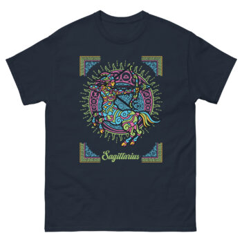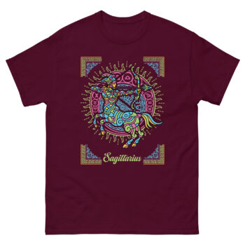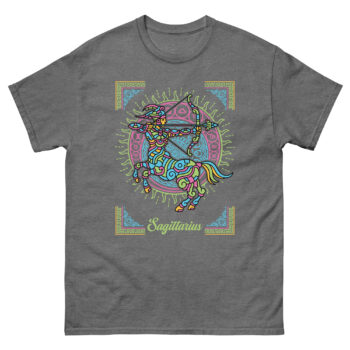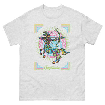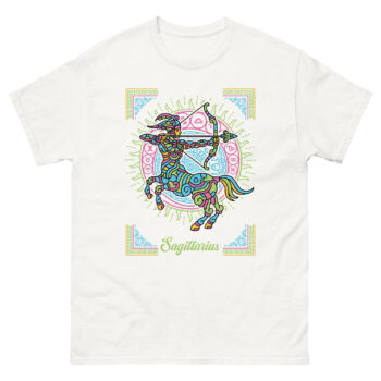 An eye-catching Sagittarius t-shirt featuring a centaur archer surrounded by cosmic patterns. Perfect for astrology lovers and those born under the Sagittarius sign.