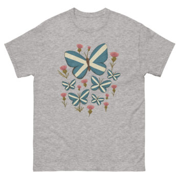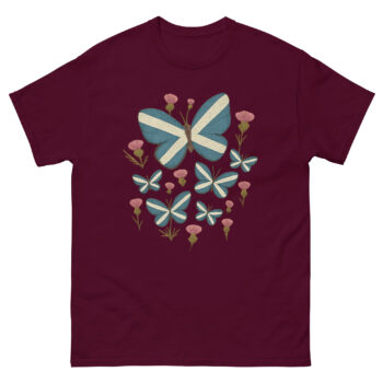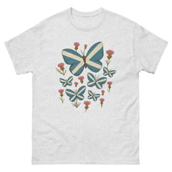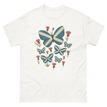 This Scotland t-shirt blends national pride with nature’s beauty, featuring butterflies adorned in the Saltire (St Andrew’s Cross) alongside pink thistles, Scotland’s national flower. The artistic, vintage-style print captures Scottish heritage in a fresh, nature-inspired way.