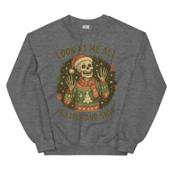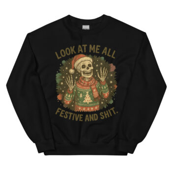 Then, there’s the caption that truly seals the deal: “LOOK AT ME ALL FESTIVE AND SHIT.” It’s the unspoken thought we’ve all had while wearing an itchy reindeer sweater to appease a relative. This dark humor christmas sweatshirt captures that feeling perfectly, making it the perfect sarcastic holiday pullover for anyone who prefers their merriment with a generous dose of realism.