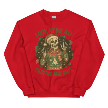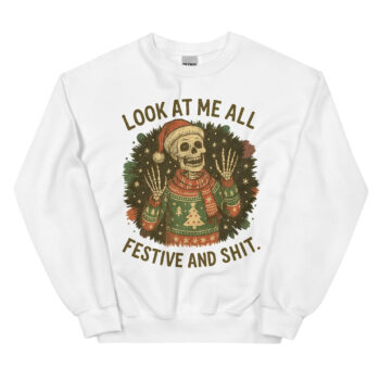 Bring some sarcastic cheer to your holiday season with this funny skeleton Christmas sweatshirt. Featuring a skeleton in an ugly Christmas sweater, Santa hat, and scarf with the bold text “Look At Me All Festive And Shit,” this pullover is perfect for those who love humor with an edge. Ideal for Christmas parties, gag gifts, or anyone who enjoys mixing sarcasm with holiday spirit.