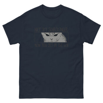 The idea for this quantum cat tee didn’t come from a physics textbook. Actually, it came from observing real cat behavior. Anyone who has lived with cats knows they hate being confined against their will. They also have a remarkable ability to look deeply unimpressed with human endeavors.