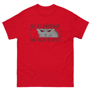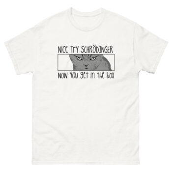 You’ve probably heard of Schrödinger’s Cat – that famous physics puzzle where a cat in a box is theoretically both alive and dead until someone looks inside. It’s a mind-bending concept that has fascinated scientists and philosophers for decades. But have you ever stopped to consider the cat’s perspective? That’s exactly what we did when creating the schrodinger cat shirt. This clever physics cat t-shirt gives a voice to the silent subject of quantum theory, turning a complex idea into wearable wit.