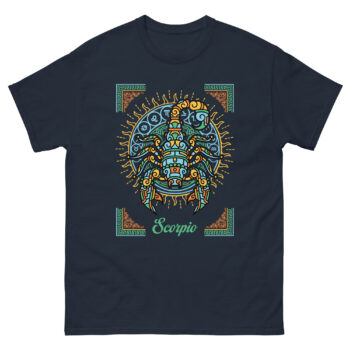 The centerpiece features a stylized scorpion, crafted with tribal and mechanical elements that reflect Scorpio’s complex nature. Encircling this powerful creature, zodiac symbols form a cosmic frame, transforming this from a simple October November zodiac t-shirt into a badge of strength.