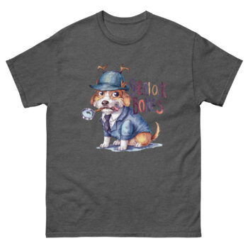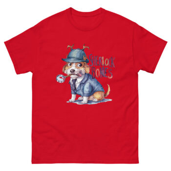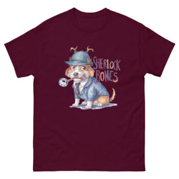 Every dog has a nose for adventure, but this “Sherlock Bones” funny detective dog t-shirt proves your pup might just be the next great investigator. Featuring an adorable cartoon dog dressed in full detective regalia – complete with hat, coat, and pipe – this cartoon dog Sherlock Holmes shirt is the perfect blend of canine charm and mystery flair.