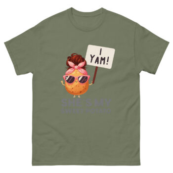 Meet our sassy sweet potato! She’s cool (thanks to the sunglasses), stylish (check out that polka-dot headband), and proudly declares “I YAM!” to the world. This isn’t just a vegetable; it’s a statement of confidence and fun. When you wear this shirt, you’re not just calling someone your sweet potato lover; you’re saying they’re unique, awesome, and totally fun to be around. It’s a couple humor design that feels personal and modern.