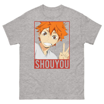 Beneath the portrait, the name “SHOUYOU” stands in powerful, red letters. This minimalist design creates a stunning Haikyuu anime protagonist top that focuses entirely on his uplifting spirit. It’s a piece of Fly High volleyball fashion that doesn’t just show a character, it embodies an entire philosophy of perseverance and joy.