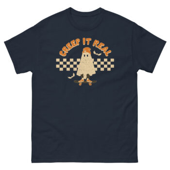 Bring spooky vibes to the skate park with this Skateboard Ghost Shirt. Featuring a retro ghost rider with the phrase “Creep It Real”, this tee blends skate culture with Halloween humor. Perfect for skaters, Halloween lovers, or anyone who enjoys a playful twist on spooky fashion.