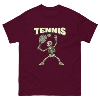 Furthermore, the clever details make this skeleton athlete t-shirt design truly special. The artist added a classic retro headband and tennis shoes, creating a funny contrast that feels like a ghost from Wimbledon’s past. Above the racket, a tennis ball hangs in the air, adding a fantastic sense of motion and tension to the scene. To top it all off, the bold, cream-colored “TENNIS” typography anchors the design with a clean, sporty vibe. Consequently, this is one of the most cool tennis graphic tees for fans who appreciate both art and athletics.