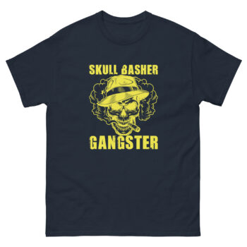 Above and below the skull, distressed block lettering screams the theme: “SKULL BASHER” at the top, and “GANGSTER” at the bottom. Both words are rendered in rugged yellow with subtle texture, enhancing the outlaw streetwear skull design. The typography adds weight to the visual message, reinforcing the shirt’s gritty, no-nonsense vibe.