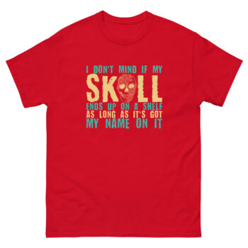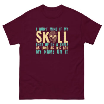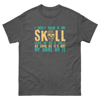 Crafted for those who dare to wear their personality on their chest, this witty skull t-shirt with quote is designed to turn heads and spark conversations. The quote—“I DON’T MIND IF MY SKULL ENDS UP ON A SHELF AS LONG AS IT’S GOT MY NAME ON IT”—isn’t just clever, it’s a reflection of self-awareness, legacy, and a dash of punk philosophy.