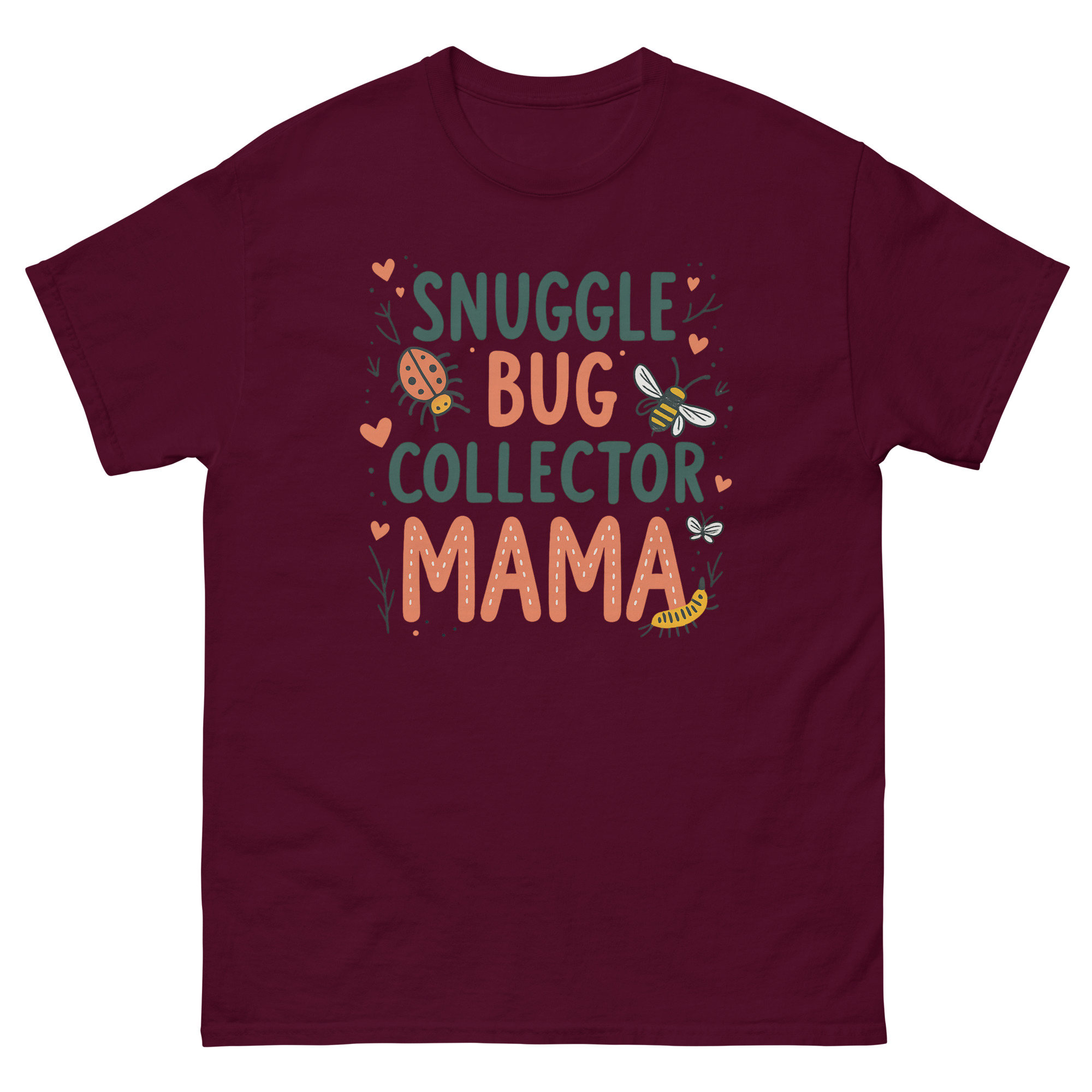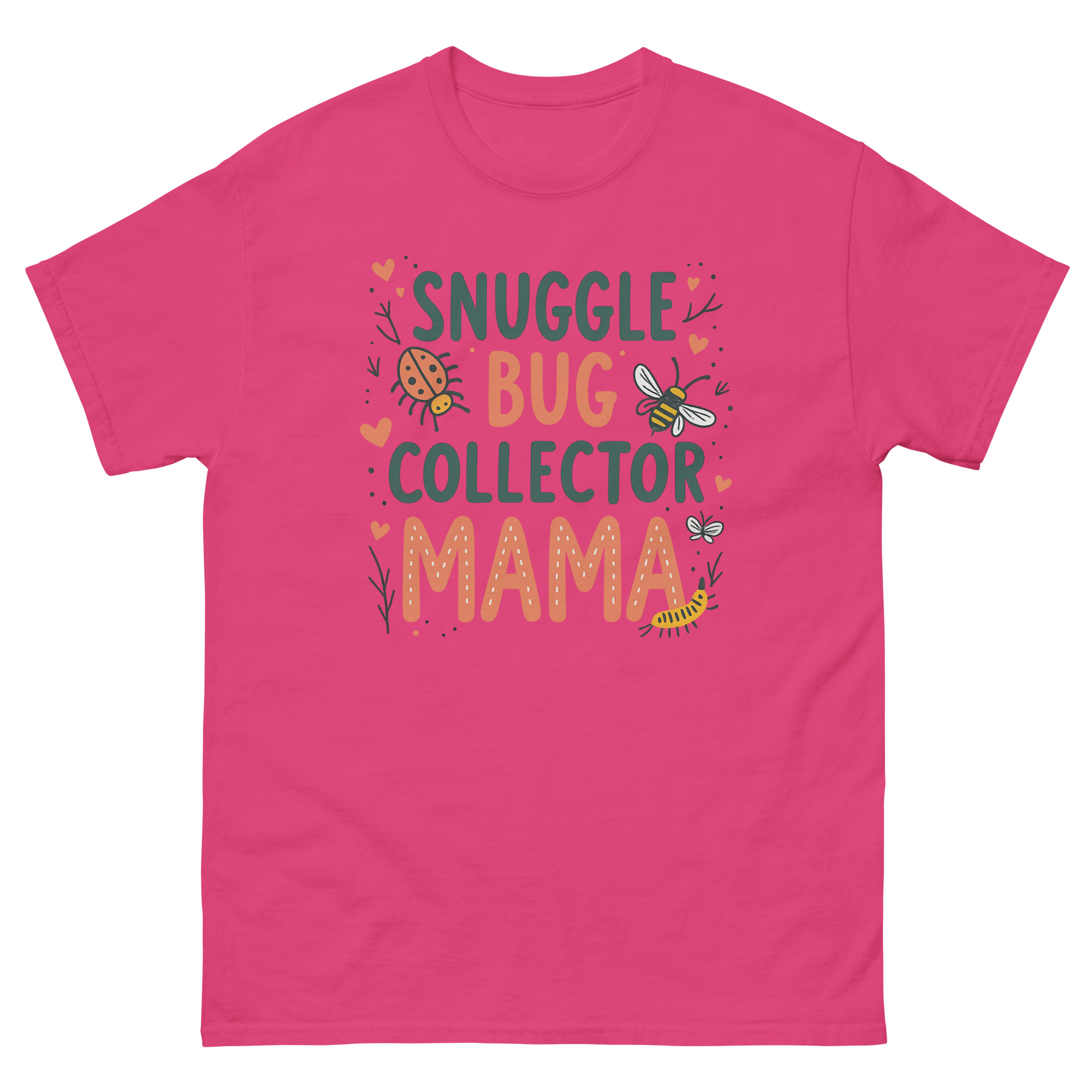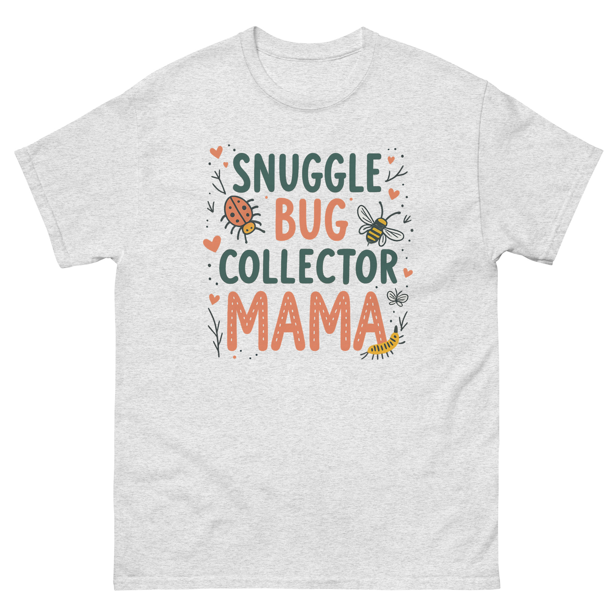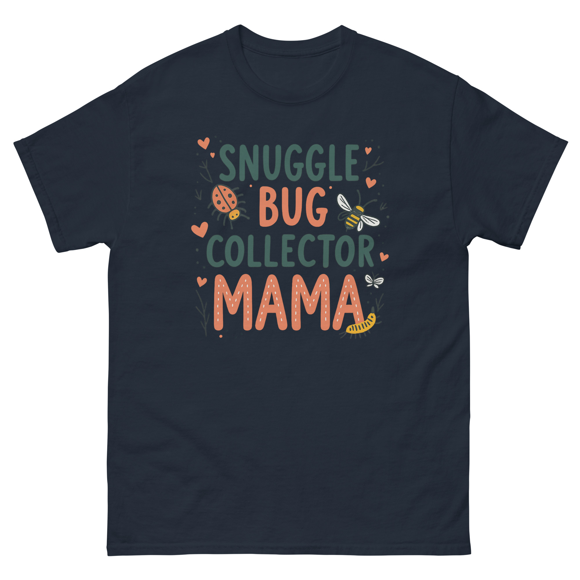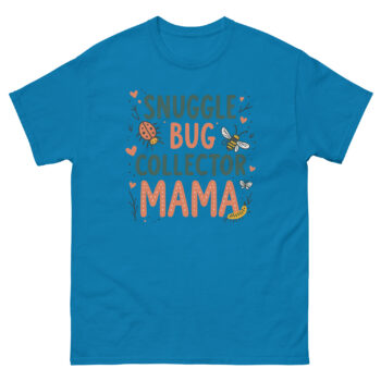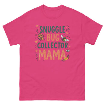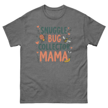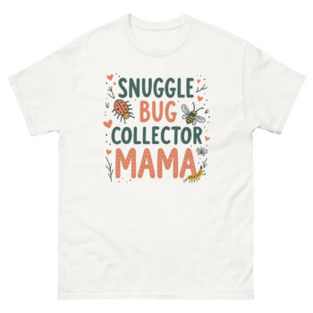 The Snuggle Bug Collector Mama T Shirt is a soft, 100% cotton classic tee designed for the mom who spends her weekends chasing toddlers through the backyard. What makes it unique is the hand-drawn artwork featuring ladybugs, bees, and caterpillars, celebrating the mothers who encourage their kids to explore nature rather than fear it. It is made for the “bug mom,” the forest school parent, or any mother whose child has ever tried to put a roly-poly in her pocket.