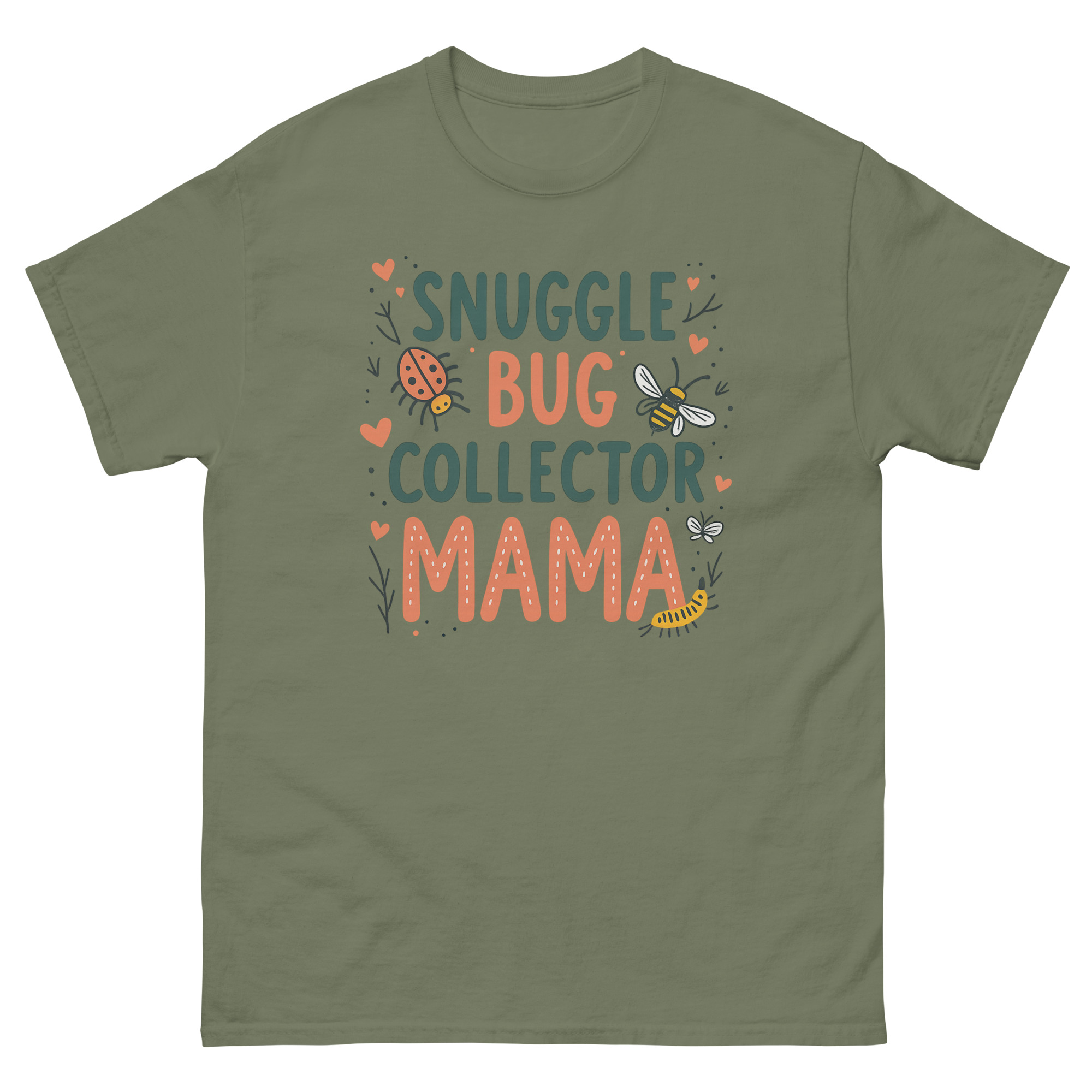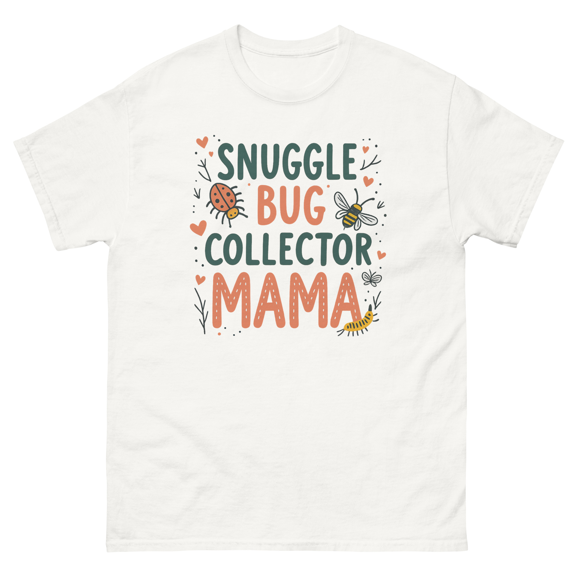 The visual layout feels like a page torn from a vintage children’s nature book. The phrase “SNUGGLE BUG COLLECTOR” is written in a crisp forest green font, acting as the title of the story. Below it, the word “MAMA” is rendered in a larger, textured terra-cotta bubble font, giving the shirt a modern, boutique feel. We filled the space around the text with illustrations that look like they were drawn with a fine-tip pen: a bright orange ladybug crawling upward, a fuzzy bee hovering near a sprig of leaves, and a caterpillar inching along. Tiny red hearts and dotted “trails” connect the elements, mimicking the way a child’s attention flits from one bug to the next. It is an earthy, grounded look that pairs the messiness of motherhood with the beauty of entomology.