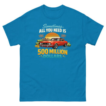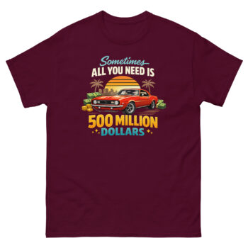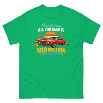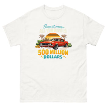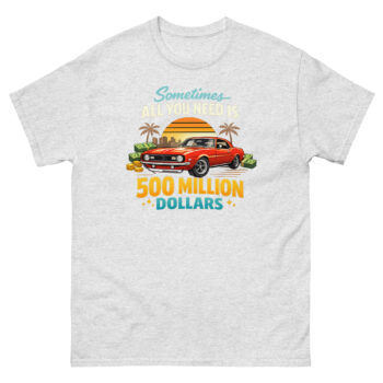 Moreover, the bold typography delivers the punchline with style. “SOMETIMES ALL YOU NEED IS” leads to the massive, impactful “500 MILLION DOLLARS.” Consequently, this piece becomes the perfect muscle car and money shirt for those who appreciate sarcastic motivation.