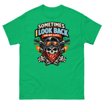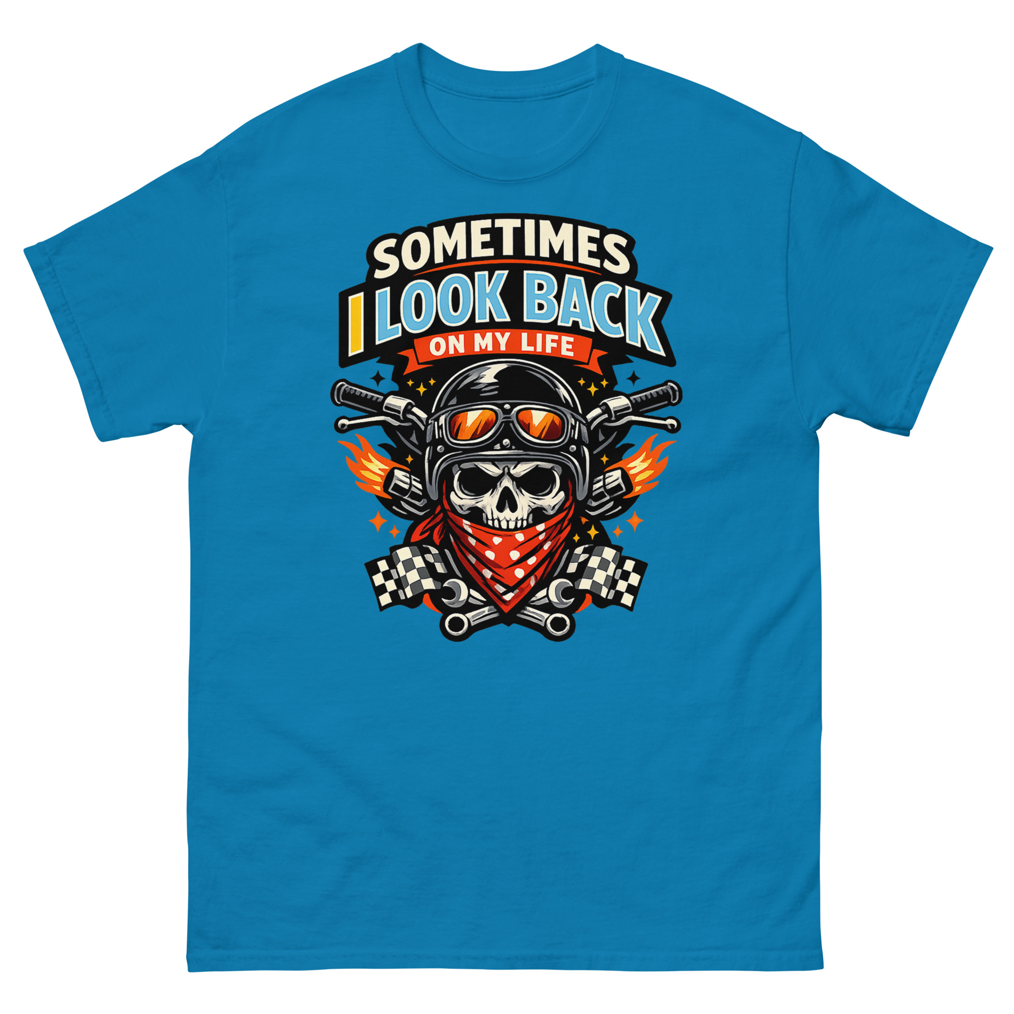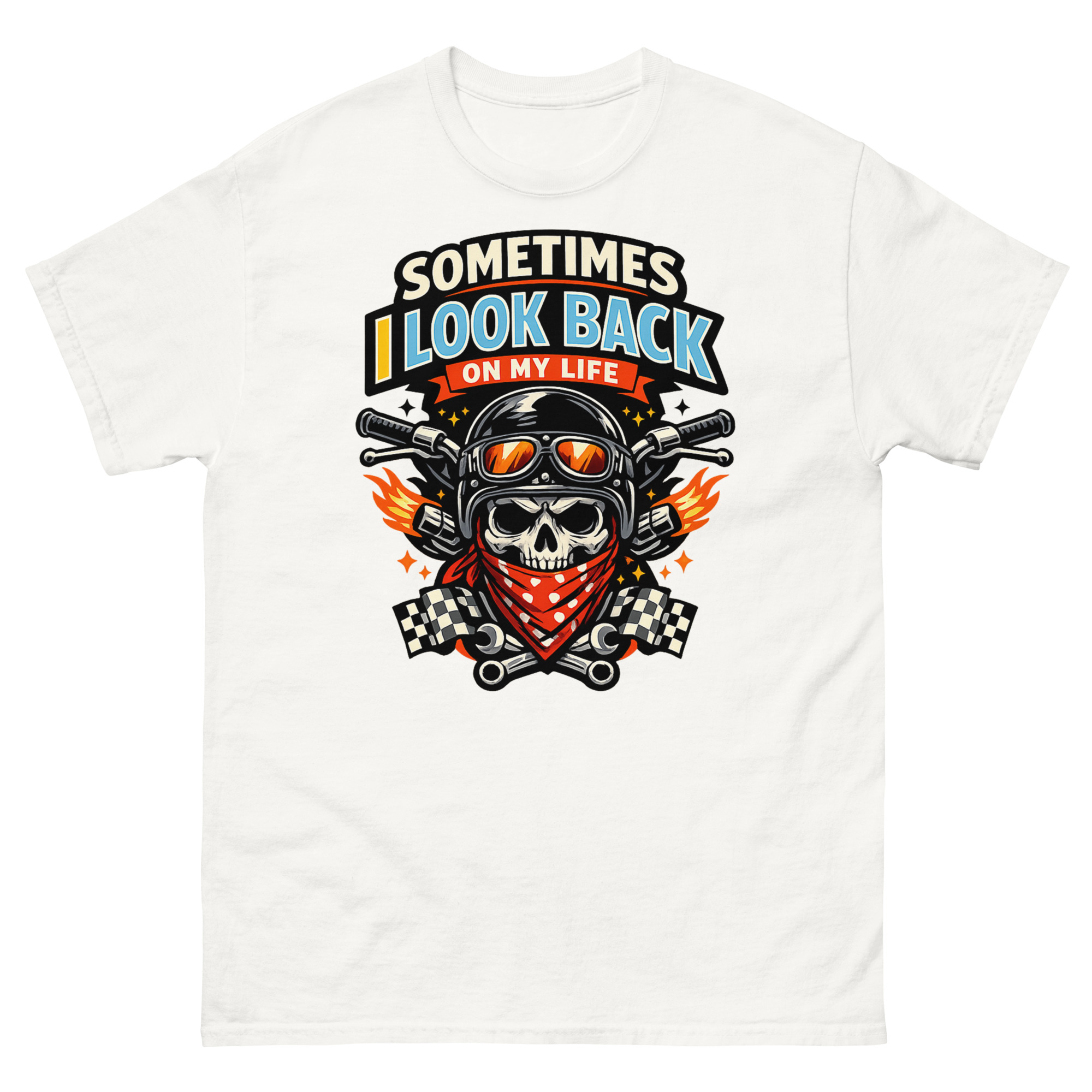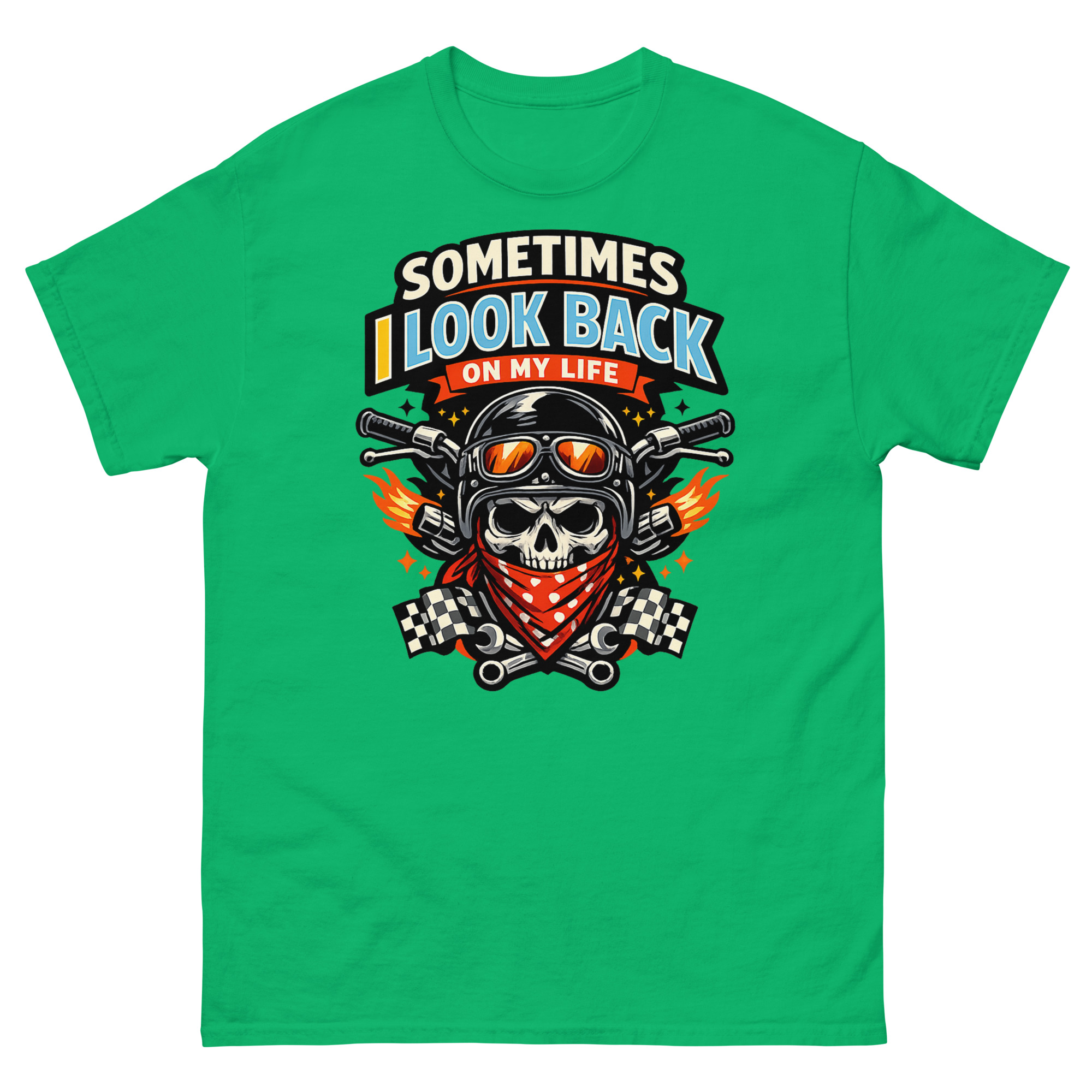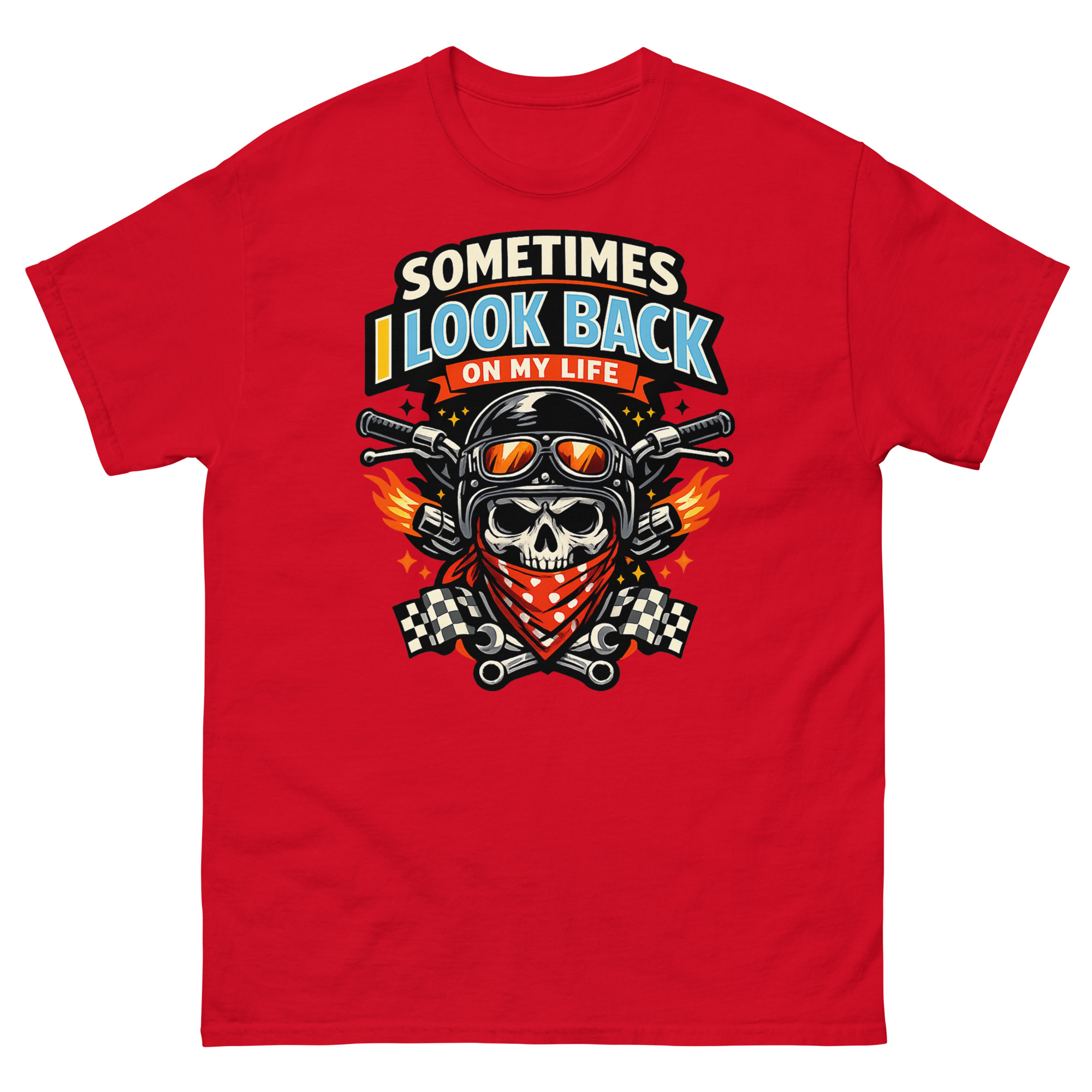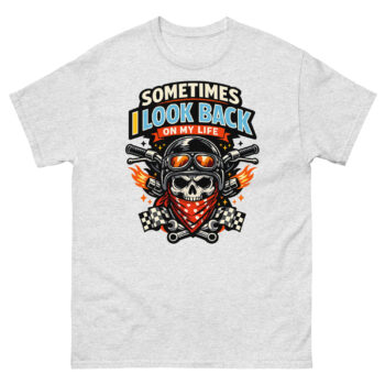 At the heart of this shirt is a striking graphic: a skull in a motorcycle helmet, goggles, and a red bandana. Behind it, flaming exhaust pipes, crossed pistons, and racing flags scream rebellion. The phrase “Sometimes I Look Back On My Life” is emblazoned across the chest in bold, colorful typography. This isn’t just art, it’s attitude.