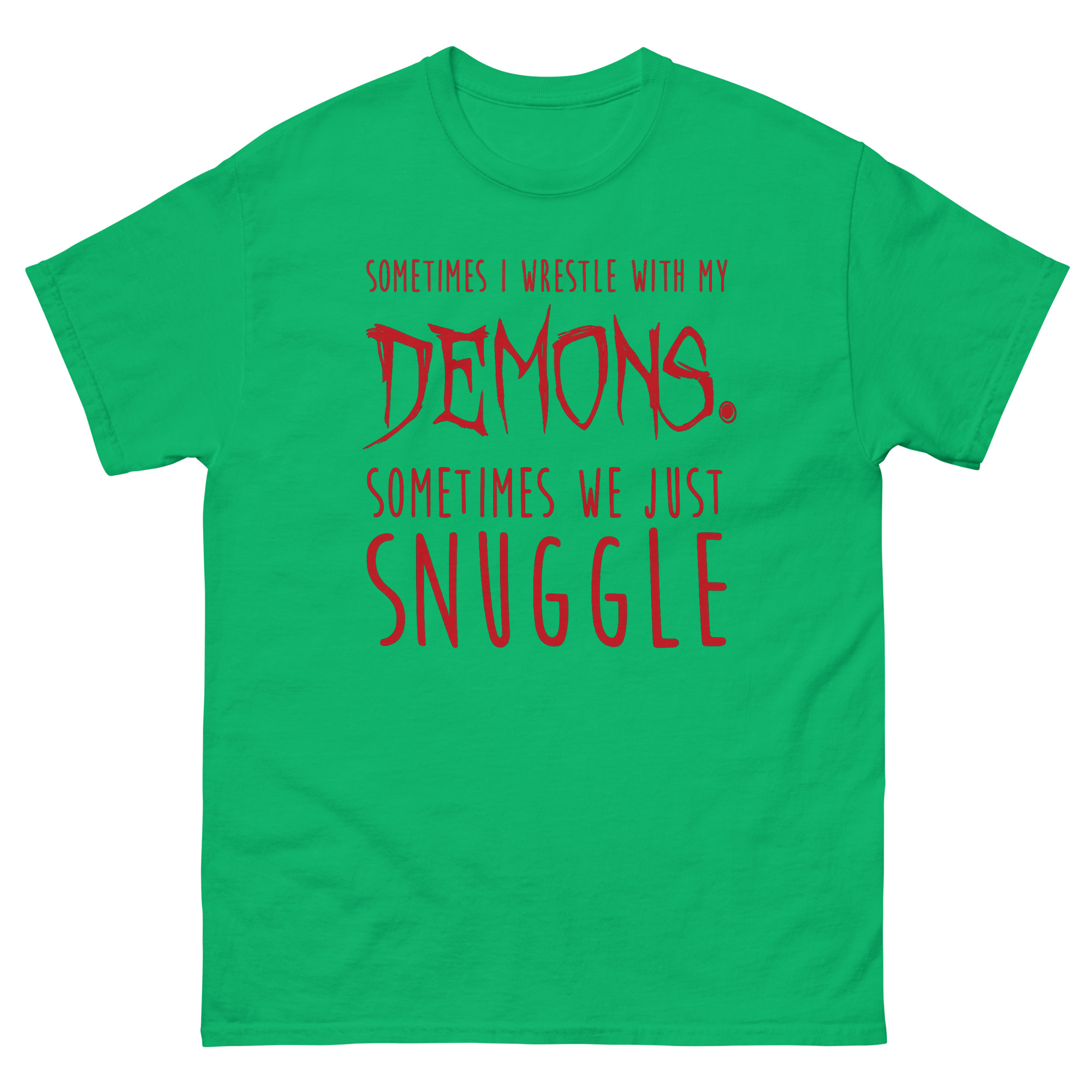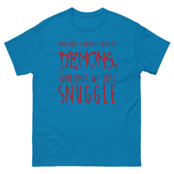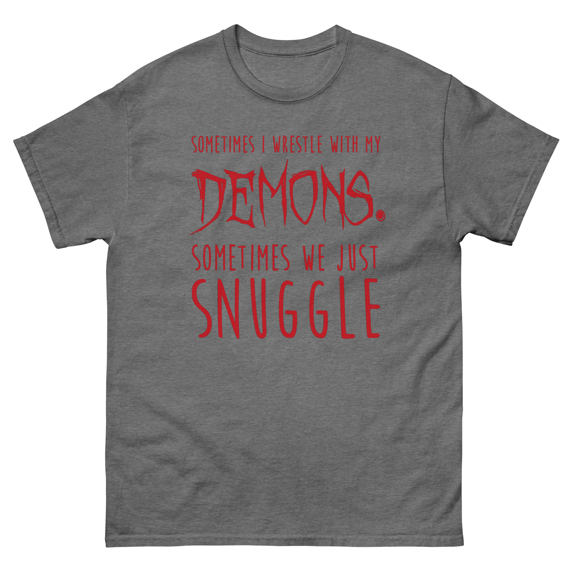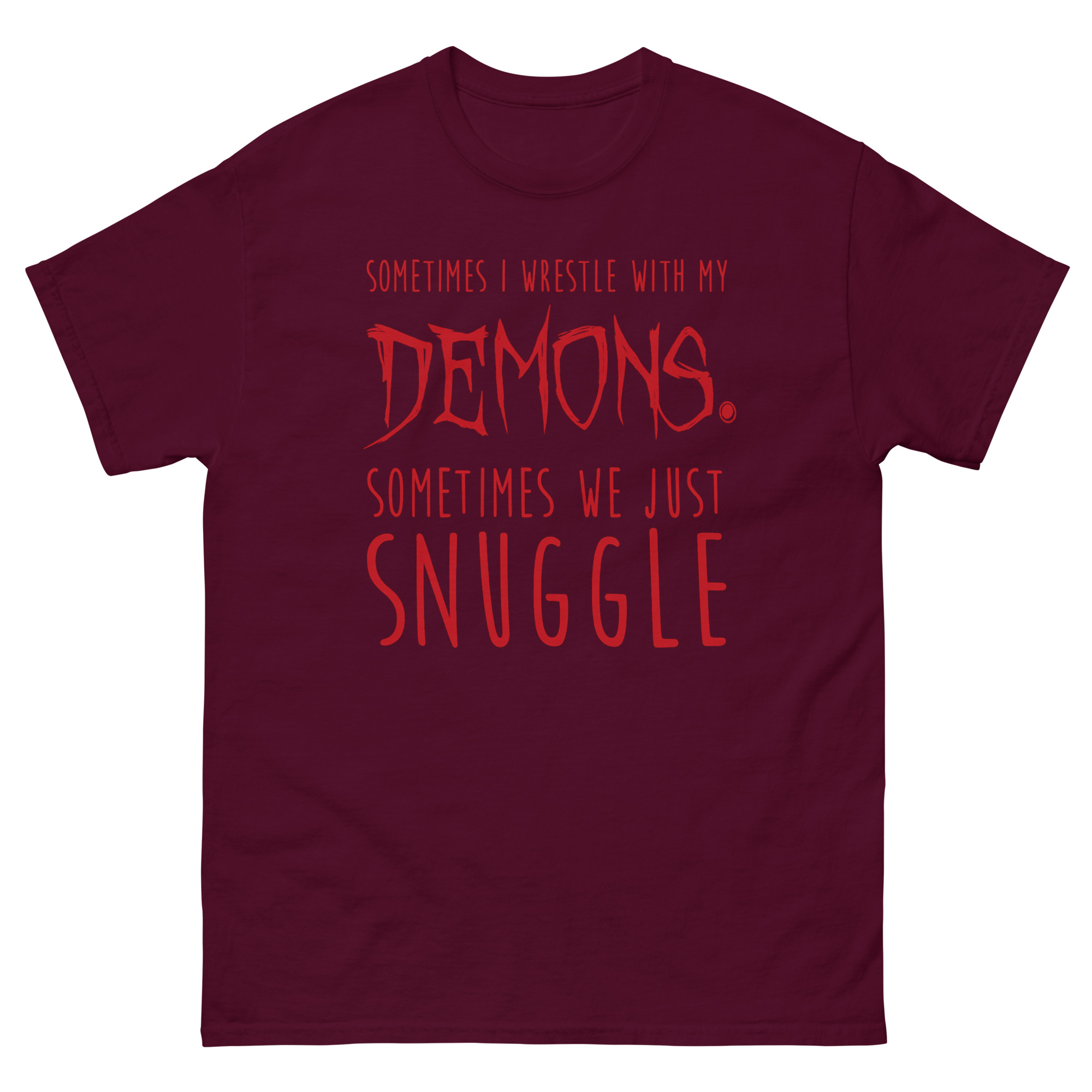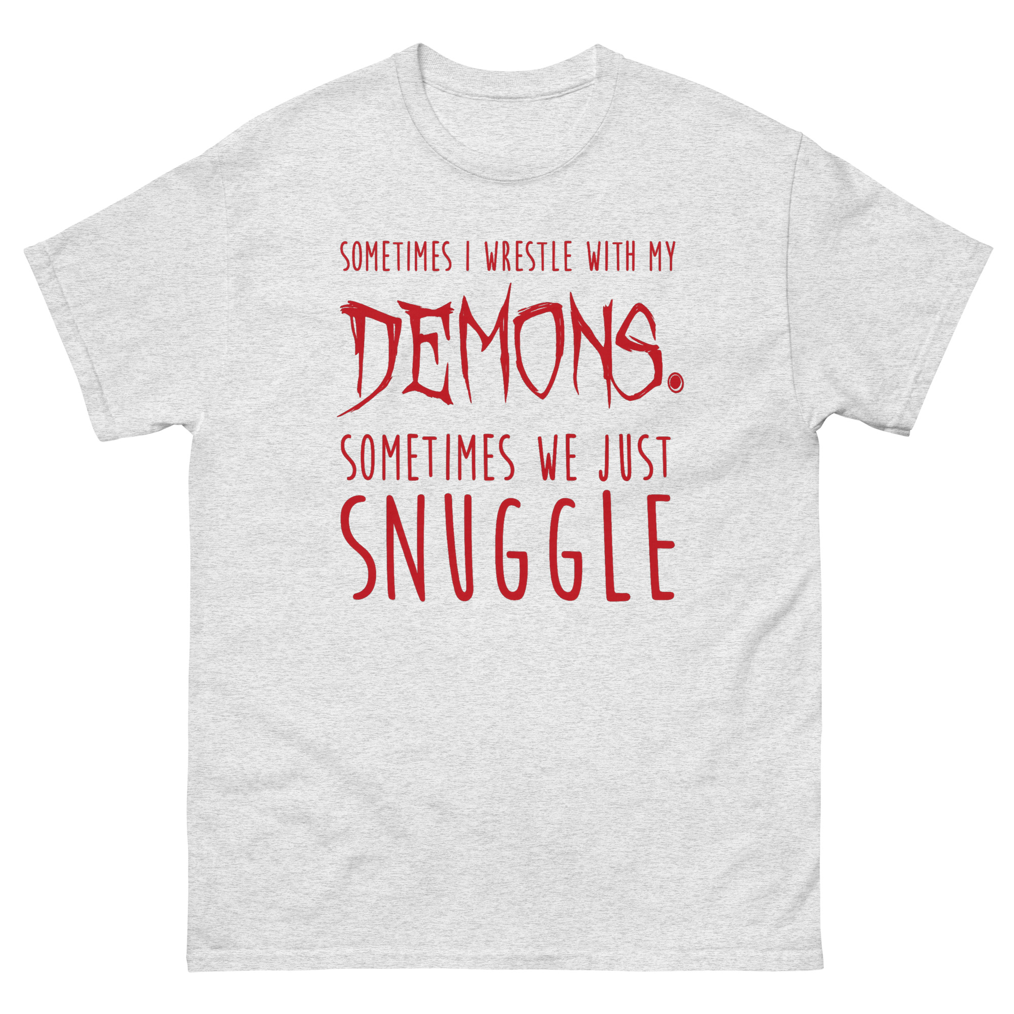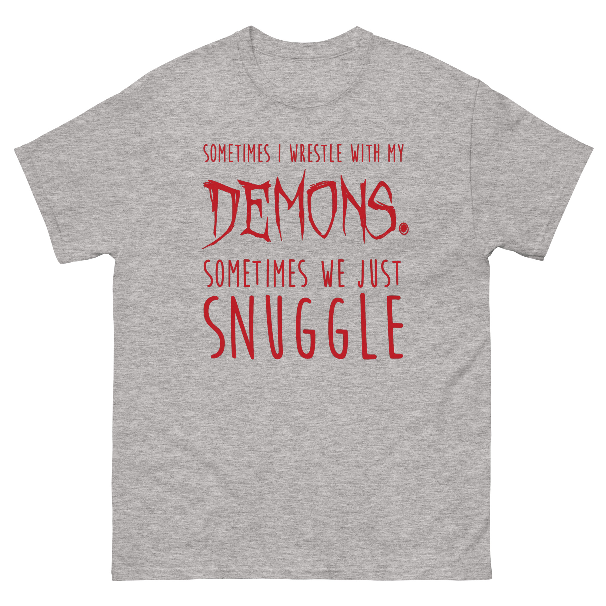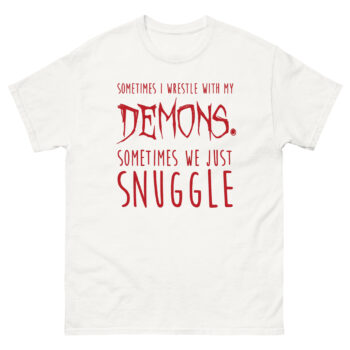 Visually, Sometimes I Wrestle With My Demons Shirt design tells this story through typography. The phrase starts clean with “SOMETIMES I WRESTLE WITH MY.” Then, the word “DEMONS.” hits in a jagged, horror-movie font that looks like it’s dripping. It’s intense. But the twist comes next. “SOMETIMES WE JUST” returns to the clean font, leading to the final word: “SNUGGLE,” set in a soft, rounded, almost cuddly typeface. This sudden shift from scary to sweet is what creates the laugh. It’s a piece of minimalist gothic apparel with a funny twist that doesn’t need illustrations to make its point. For many, it’s the perfect sarcastic t-shirt for anxiety that feels honest without being heavy.