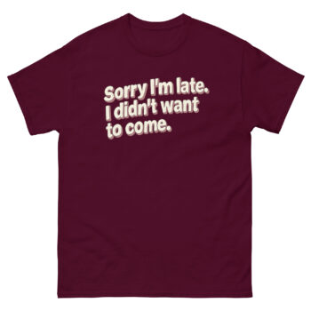 Make a bold, humorous statement without saying a word with our “Sorry I’m late. I didn’t want to come.” t-shirt. This sarcastic tee is designed for those who appreciate witty humor, cherish their personal space, and often find themselves at social gatherings wishing they were elsewhere.