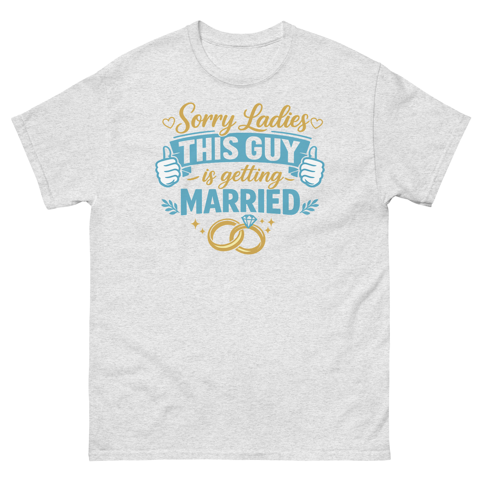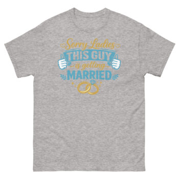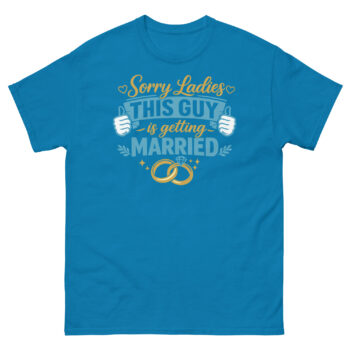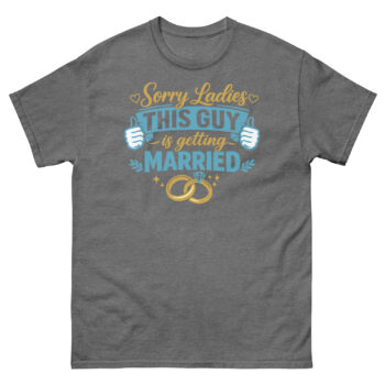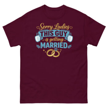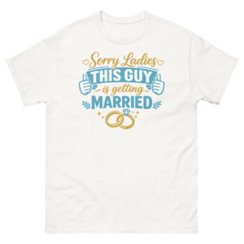 We created Sorry Ladies This Guy is Getting Married T Shirt to celebrate the groom’s transition with a good-natured sense of humor. Our “Playful Confidence” philosophy uses the shirt as a lighthearted way for a man to announce his new status. The inspiration came from wanting to provide grooms with fun, stylish apparel that reflects their excitement without being cheesy.