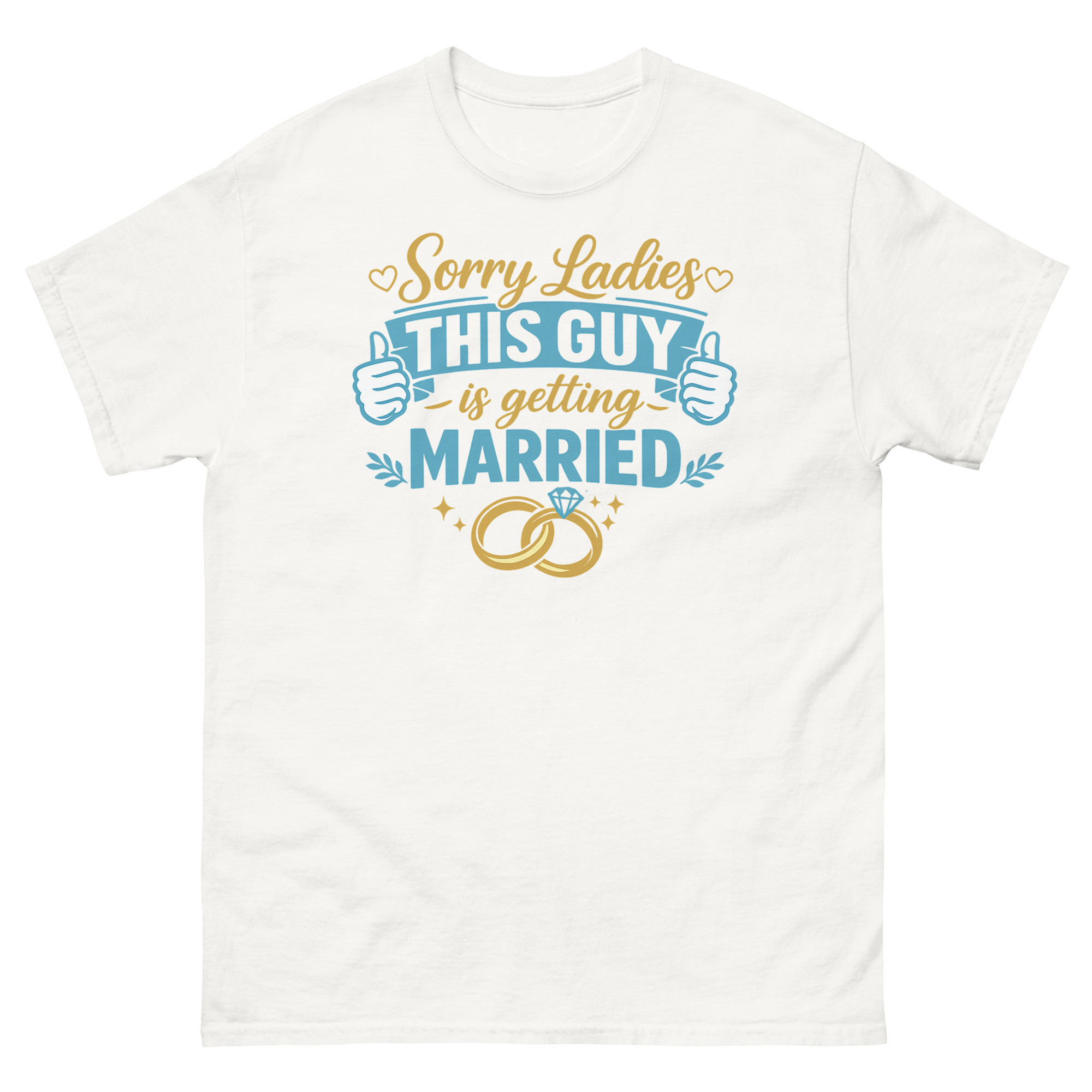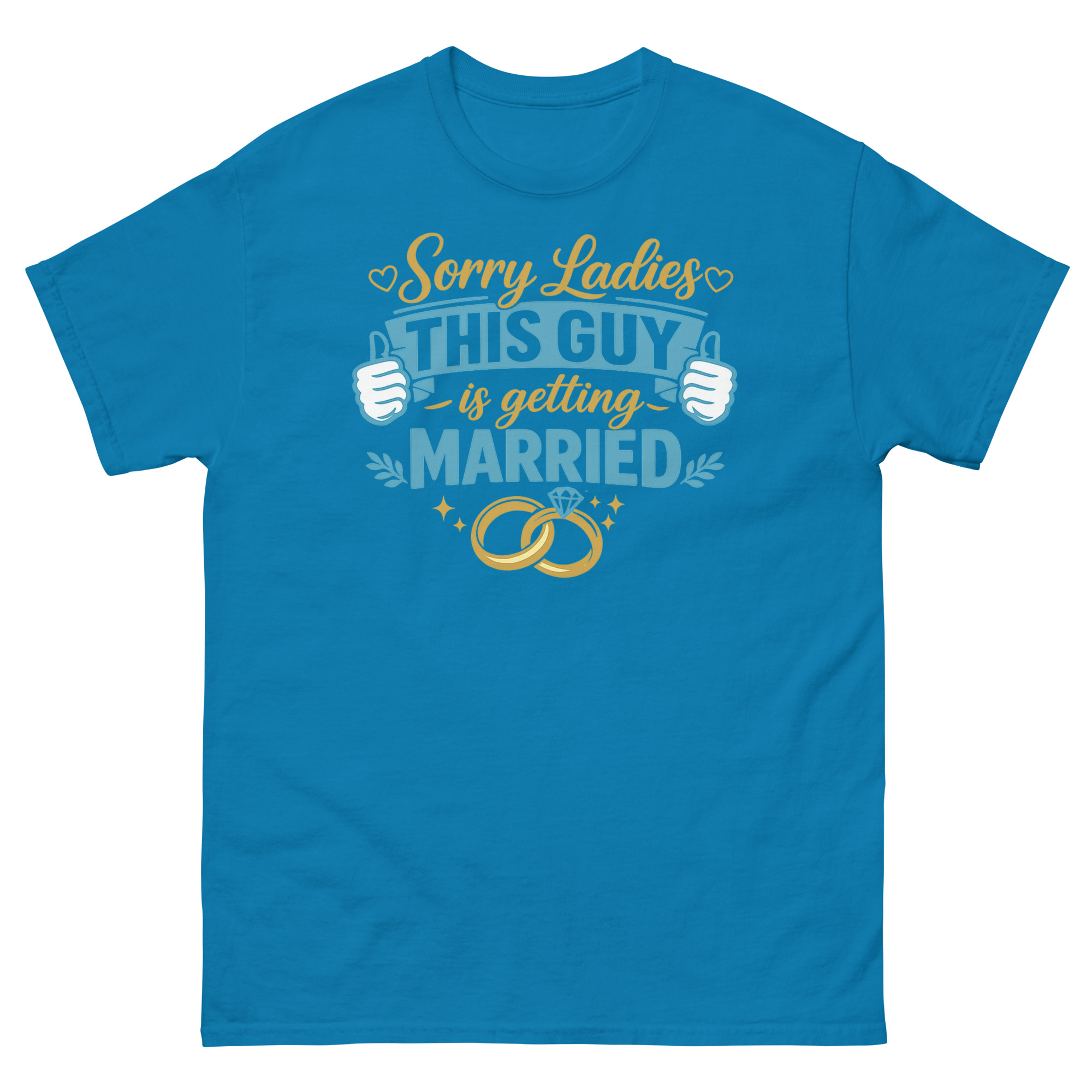 The Sorry Ladies This Guy is Getting Married T Shirt is a playful and confident tee designed for the groom-to-be. Its unique design combines elegant gold script with bold graphics, including wedding rings and thumbs-up icons. This shirt is made for the man celebrating his upcoming wedding, making it one of the best funny shirts for the groom to wear at bachelor parties or rehearsal dinners.
