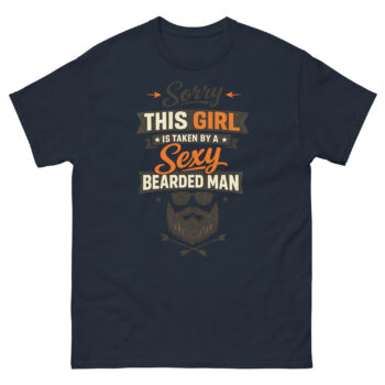 The Sorry This Girl is Taken by a Sexy Bearded Man T Shirt is a bold and humorous tee that playfully declares a woman’s relationship status. Its unique design combines vintage typography with a cool graphic of a bearded man, celebrating “beard culture” with style. This shirt is designed for women who love their bearded partners, making it a perfect funny anniversary gift or a cute off the market shirt for proud girlfriends.