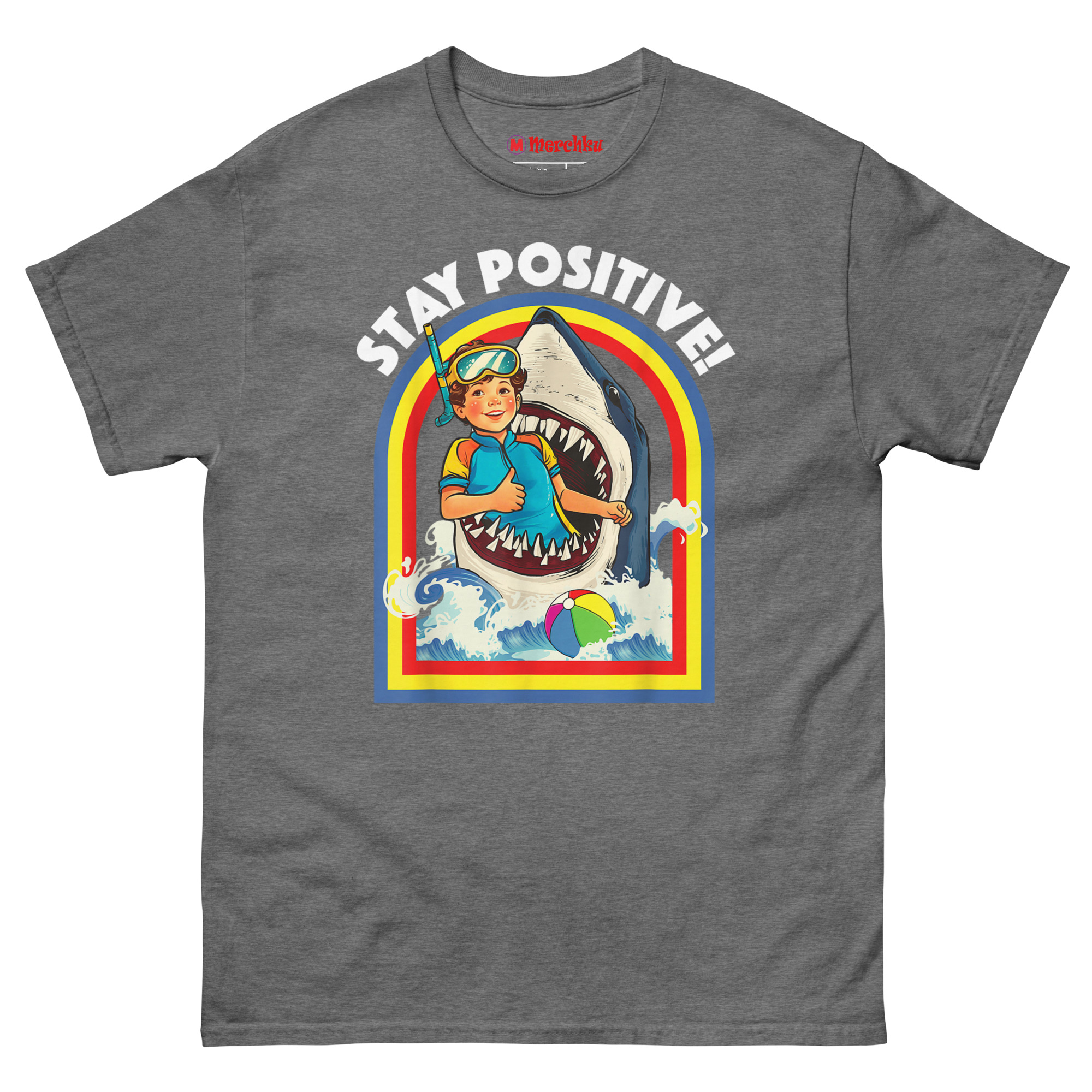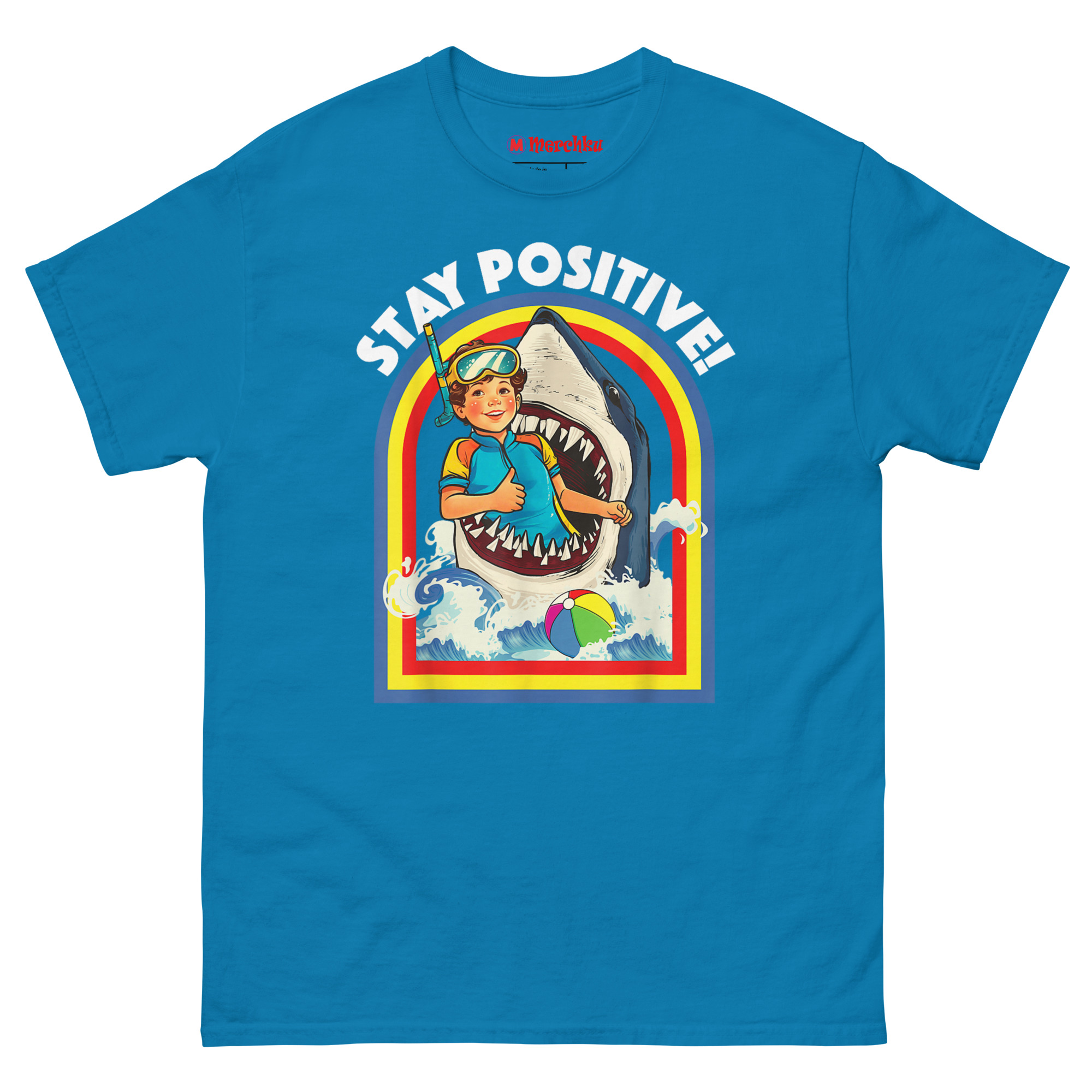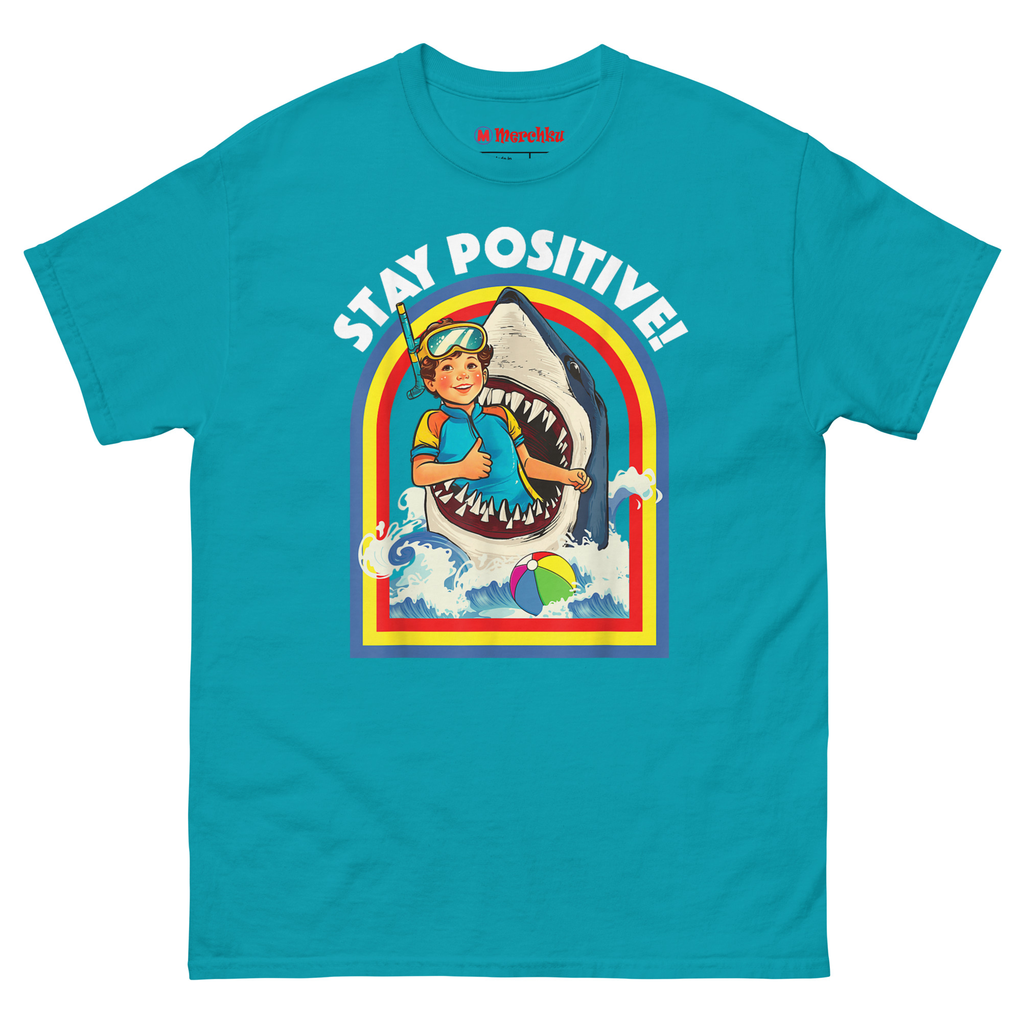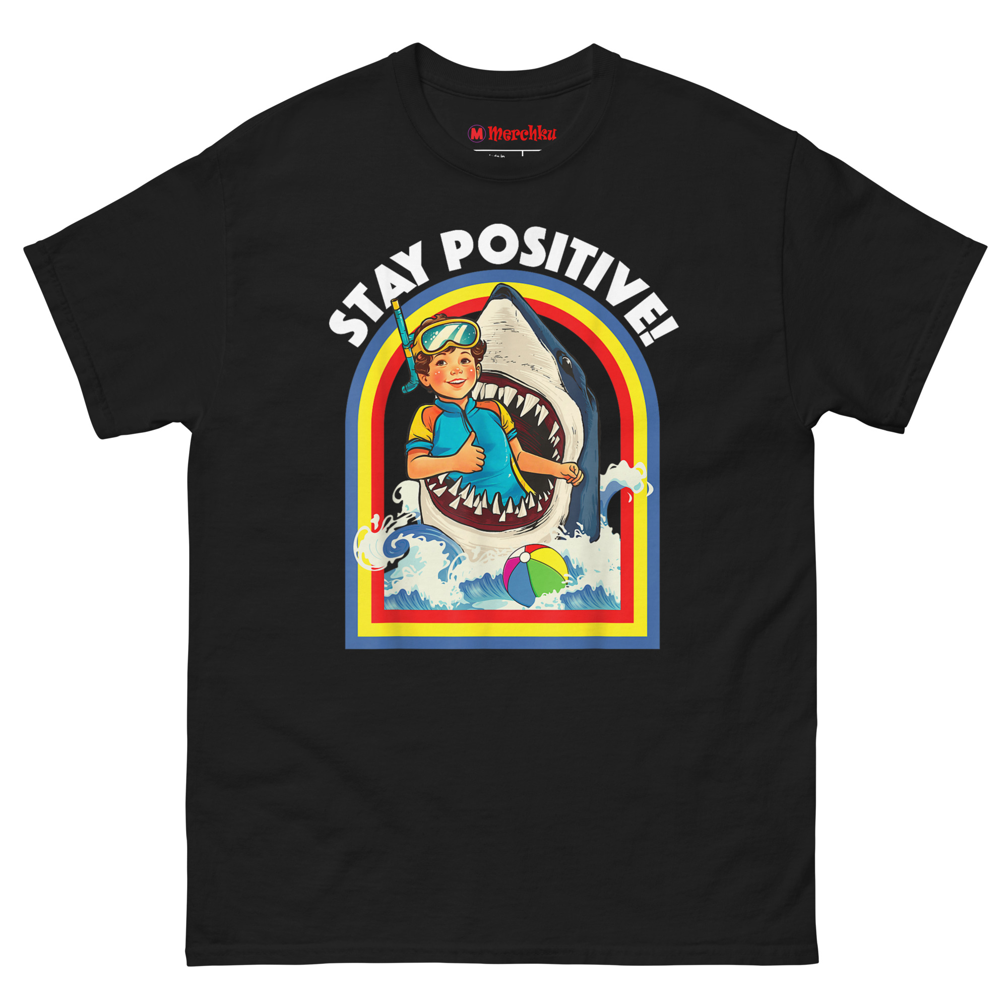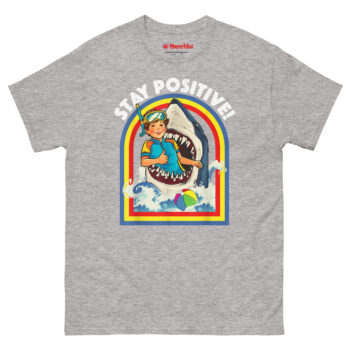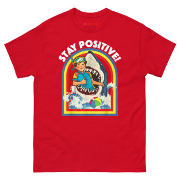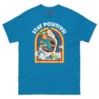 That idea became “Toxic Positivity” meets “Subversive Resilience.” We imagined the most absurdly dangerous situation possible, being eaten by a shark and paired it with a sunny, motivational slogan. The curly-haired boy in his retro wetsuit and goggles isn’t panicking. He’s giving a thumbs-up. The rainbow arch, the stylized waves, the beach ball floating by it all screams 1970s children’s activity book. The contrast between the “gory-cute” image and the “STAY POSITIVE!” text creates the joke. Stay Positive Sharks T Shirt a satirical take on modern motivational culture, perfect for anyone who finds humor in the absurd. This makes it a standout choice for funny shark week outfit for adults with dark humor.
