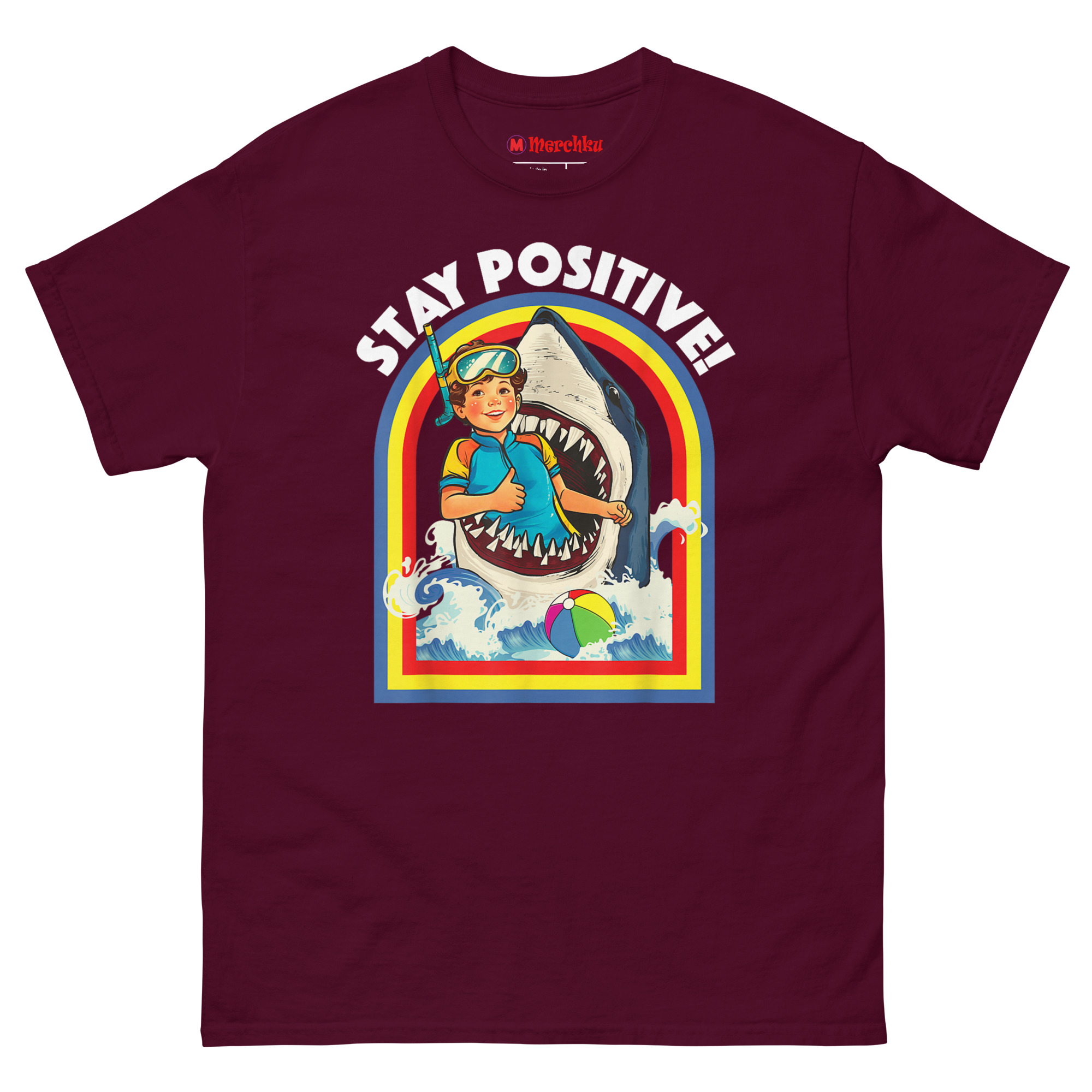 The Stay Positive Sharks T Shirt delivers a hilarious punchline wrapped in a bright, retro package. A cheerful snorkeling kid gives a thumbs-up from inside a Great White shark’s mouth, all framed by a vintage rainbow arch. It’s the perfect Stay Positive sarcastic shark gift for anyone who appreciates dark humor and a 1970s aesthetic.