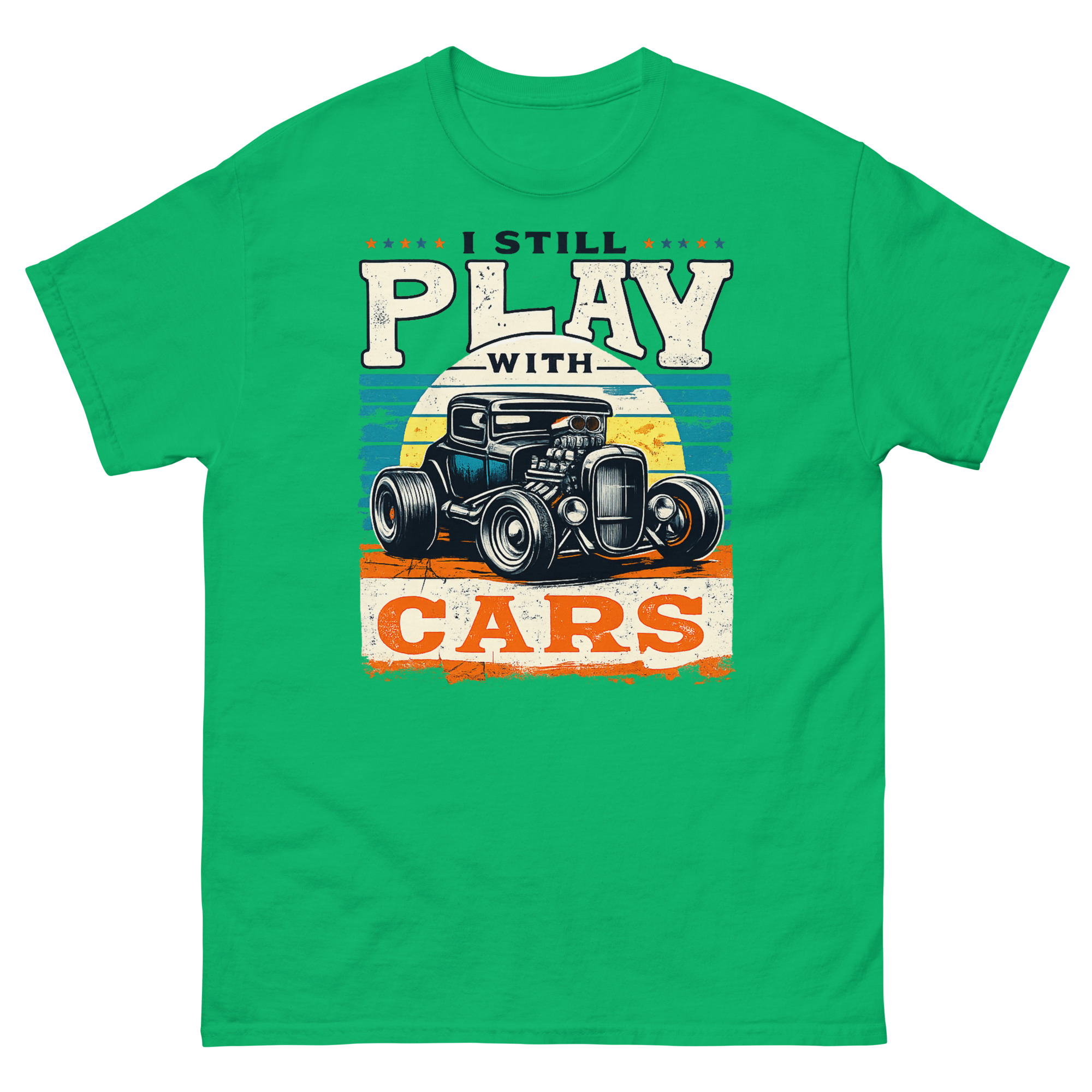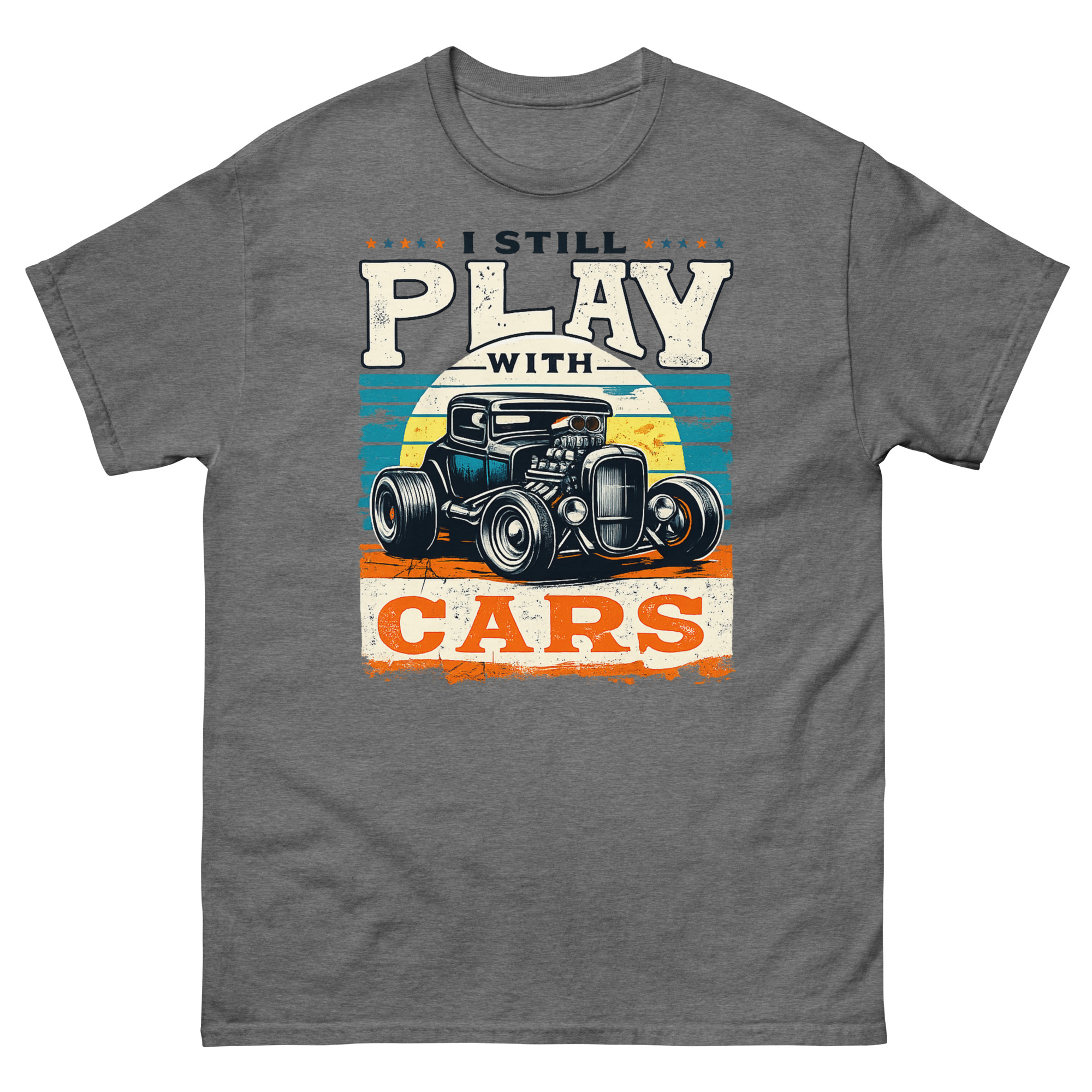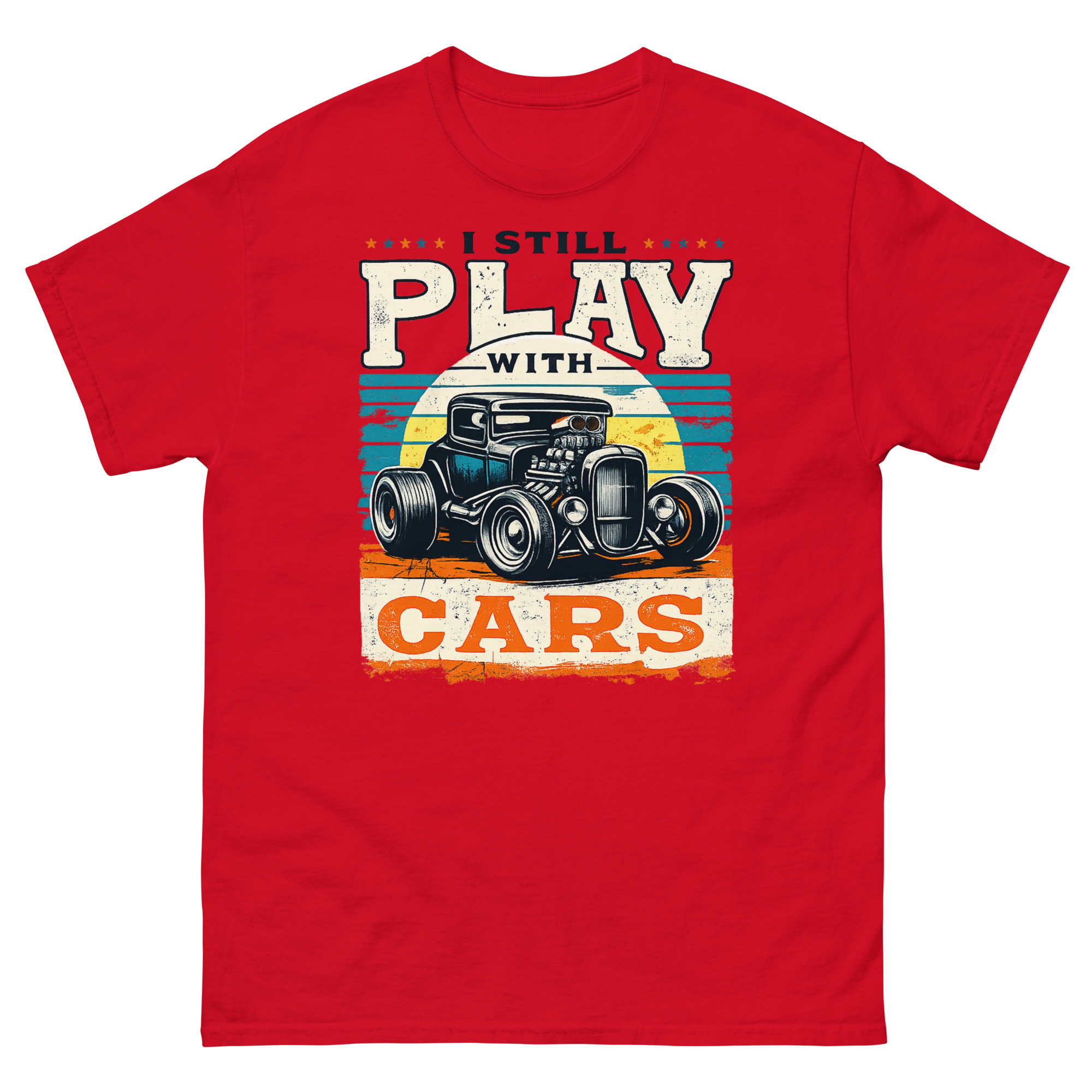 The phrase “I STILL PLAY WITH CARS” is the core of the idea. It’s a nod to that kid who spent hours with toy cars on the living room floor, who has now grown into an adult with grease under their nails and a project in the garage. The Still Plays With Cars T Shirt design taps directly into garage culture and retro Americana vibes. Think of it as vintage drag racing apparel that speaks your language, whether you’re into classic car restoration or just love the aesthetic of a mean-looking rat rod.