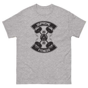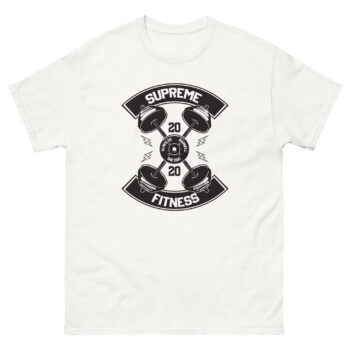 The Supreme Fitness – 2020 t-shirt is a modern monochrome design for serious lifters and gym lovers. It features two crossed dumbbells around a central weight plate with “Supreme Fitness” banners above and below, flanked by the year 2020. Crisp black and white graphics give it a bold, versatile look perfect for training or streetwear.