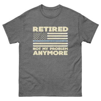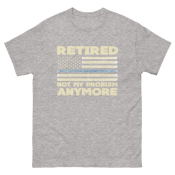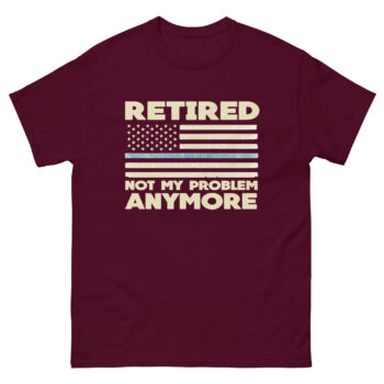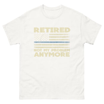 The Retired Not My Problem T-Shirt Supporting Police is designed for proud law enforcement supporters and retired officers. With a bold thin blue line American flag graphic, this shirt makes a statement of respect and solidarity for police. It’s the perfect gift for retired law enforcement, family members, or anyone who backs the blue and appreciates the service of officers.