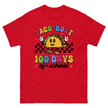 Celebrate the 100th day of school in taco-tastic style with this fun and colorful t-shirt! Perfect for teachers, students, and classrooms alike, this design features a smiling taco and bold typography that makes learning extra festive.