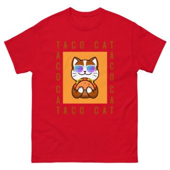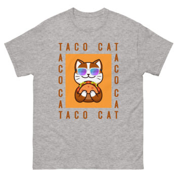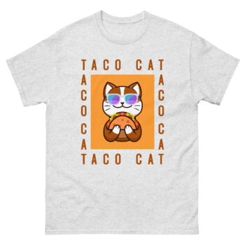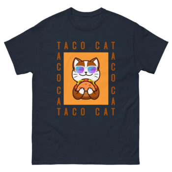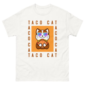 Surrounding the central artwork, the phrase “TACO CAT” repeats in a square pattern, reinforcing the palindrome theme. It’s a funny foodie cat shirt that’s perfect for:
