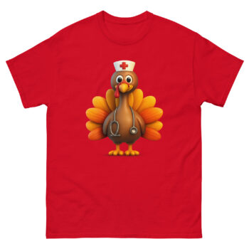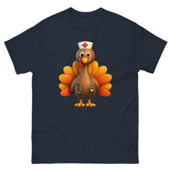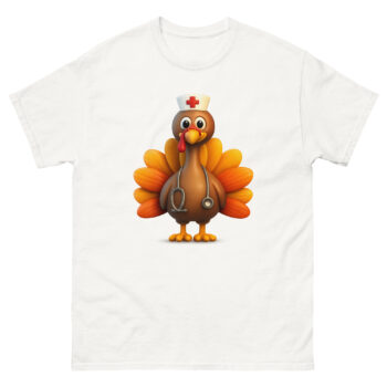 Add some humor to your scrubs this holiday with this Thanksgiving Nurse Turkey T-Shirt. Featuring a festive cartoon turkey dressed as a nurse with a stethoscope, this tee is perfect for nurses, doctors, and healthcare workers who want to celebrate Thanksgiving in style. Makes a great gift for coworkers, medical staff, or nursing students during the fall season.