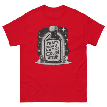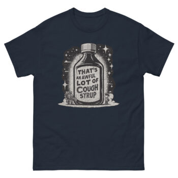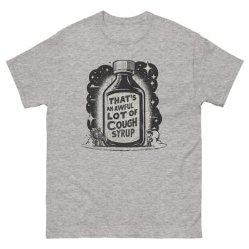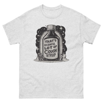 The phrase “That’s an awful lot of cough syrup” is a popular meme from internet culture. It’s often used as a humorous and ironic way to comment on someone’s over-the-top, strange, or “out-there” behavior. The shirt celebrates this specific piece of online humor, making it a fun item for those who recognize the reference.