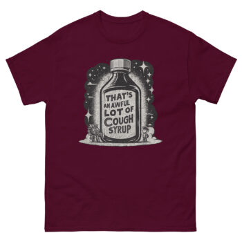 The “That’s an Awful Lot of Cough Syrup” Shirt blends vintage design with meme culture. Featuring a bold bottle graphic and retro-style typography, this shirt is cool for fans of internet humor, collectors of viral designs, or anyone who enjoys ironic pop-culture fashion. It’s soft, lightweight, and built to start conversations, a must-have for anyone with a sarcastic streak.