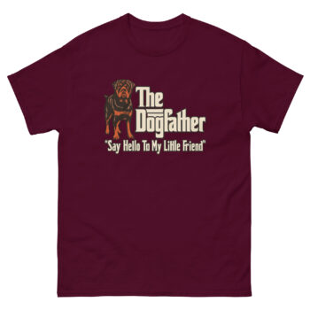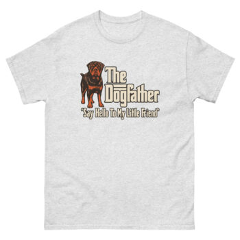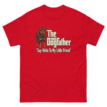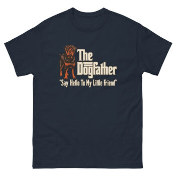 Next to this formidable figure, the iconic text “The Dogfather” is emblazoned in a font that perfectly mimics the legendary Godfather logo. This clever visual parody is instantly recognizable and guaranteed to get a laugh. But the design doesn’t stop there. Beneath it lies the brilliant tagline: “Say Hello To My Little Friend”—a playful nod to another iconic film line that adds an extra layer of cinematic flair and humor.