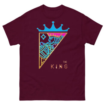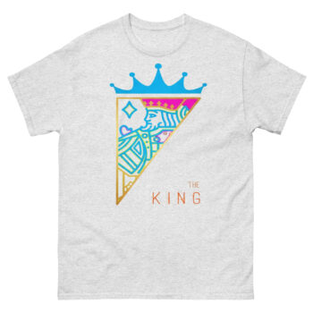 Bold Typography: Below, the words “THE KING” are printed in large, distressed letters. This gritty texture gives it an urban, earned-your-stripes vibe. It’s a trendy king shirt gift for him that speaks volumes without saying a word.