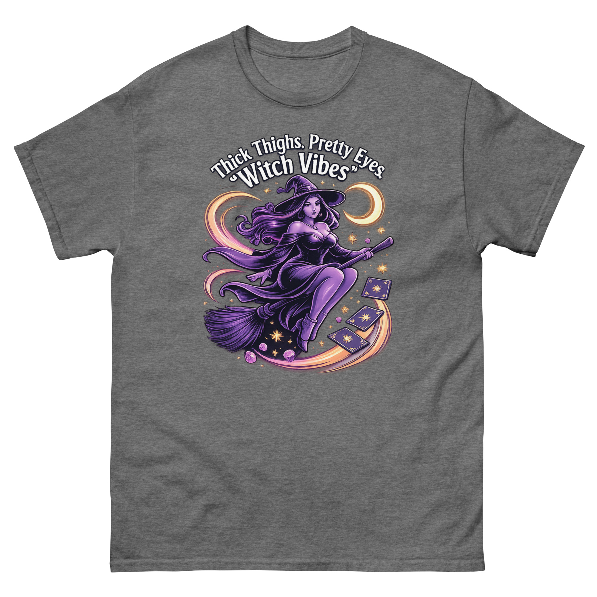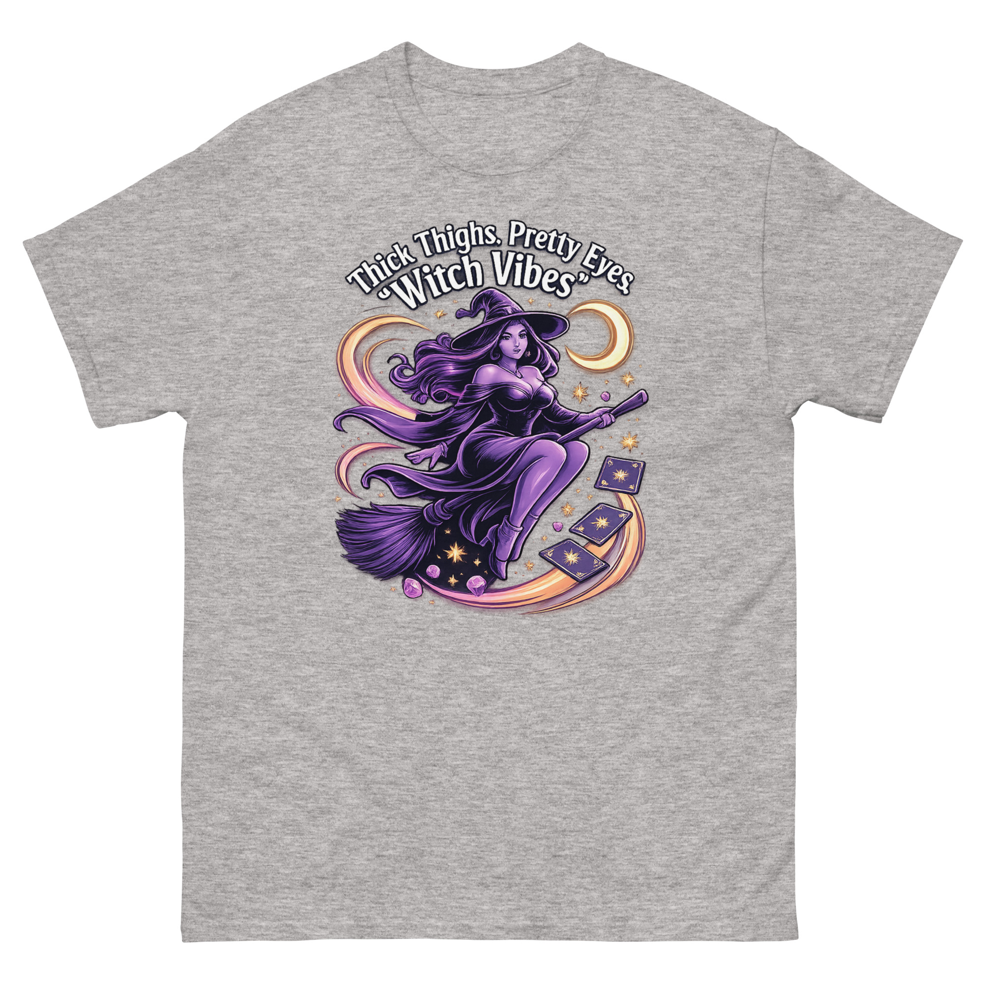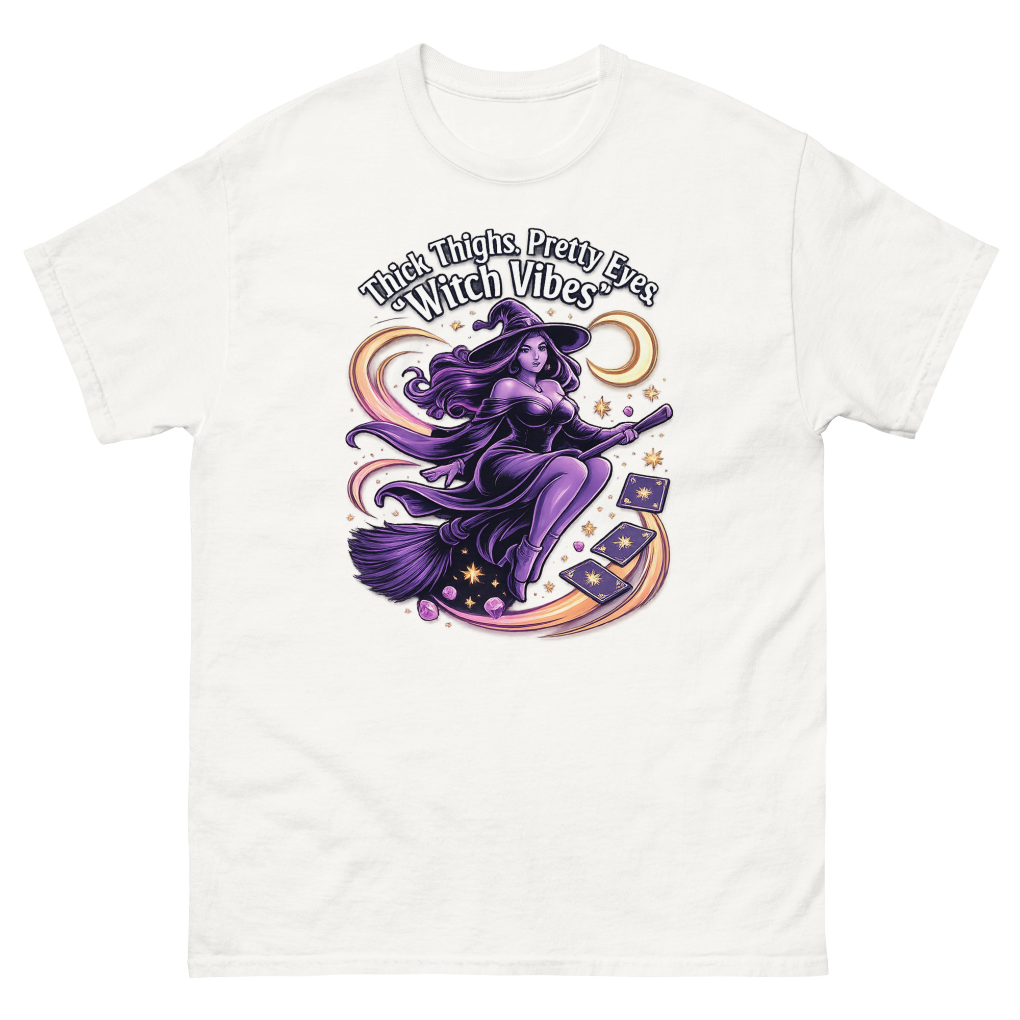 The Thick Thighs and Pretty Eyes T-Shirt is a bold, body-positive graphic tee designed for confident women who love playful fashion. Featuring a vibrant witch-themed design printed using eco-friendly DTG inks, this shirt blends comfort, style, and personality. It’s perfect for those who embrace their curves and want to express their vibe with flair.