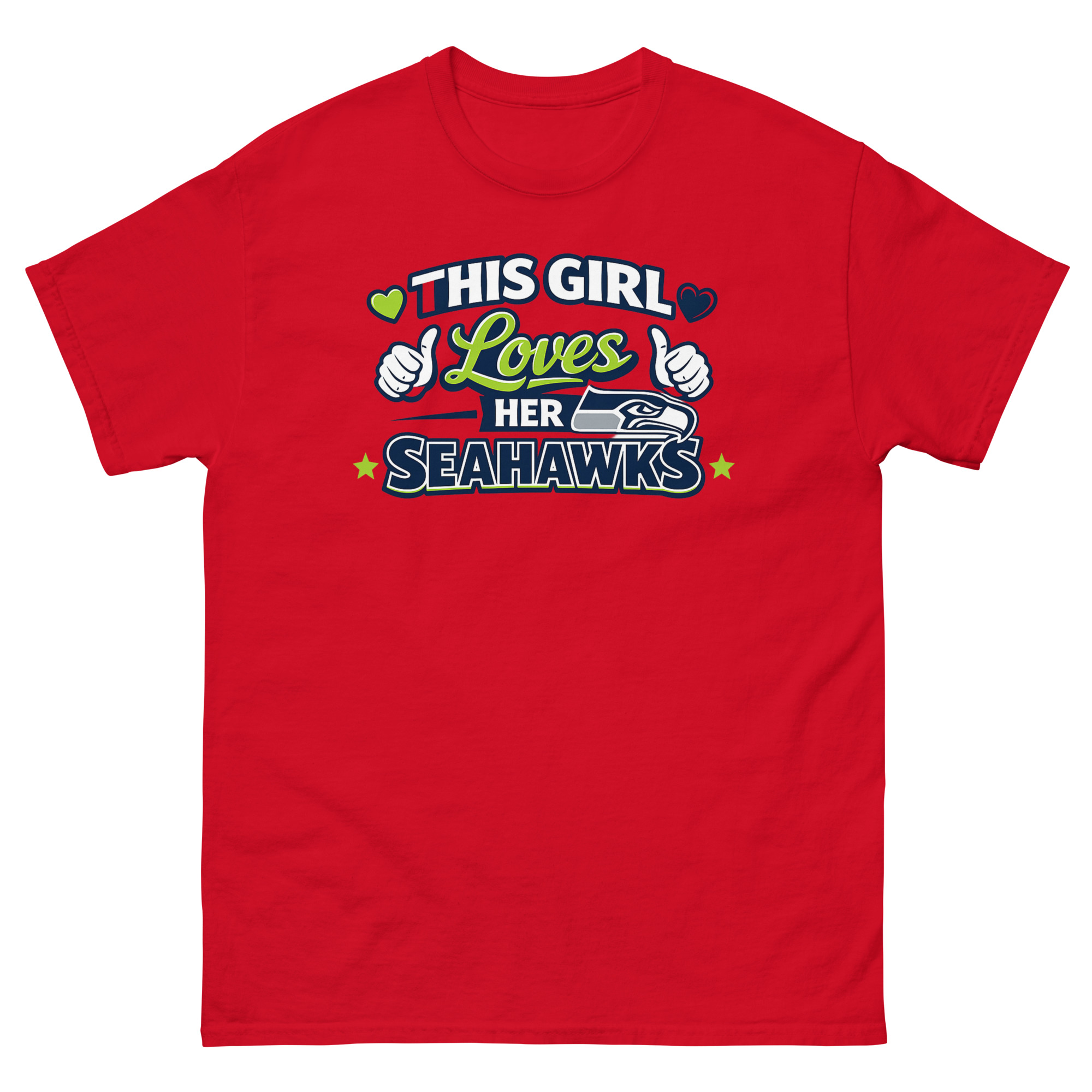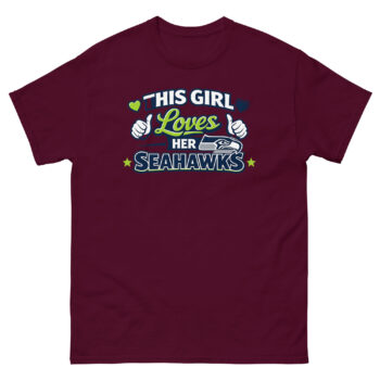 The This Girl Loves Her Seahawks T Shirt is a vibrant and spirited tee designed specifically for female members of the 12s. Its unique design uses the iconic Seattle colors and blends bold team graphics with feminine script and fun thumbs-up icons. This shirt is made for women and girls who are passionate Seattle fans, making it a top pick for game day outfits or a birthday gift for a Seahawks obsessed friend.