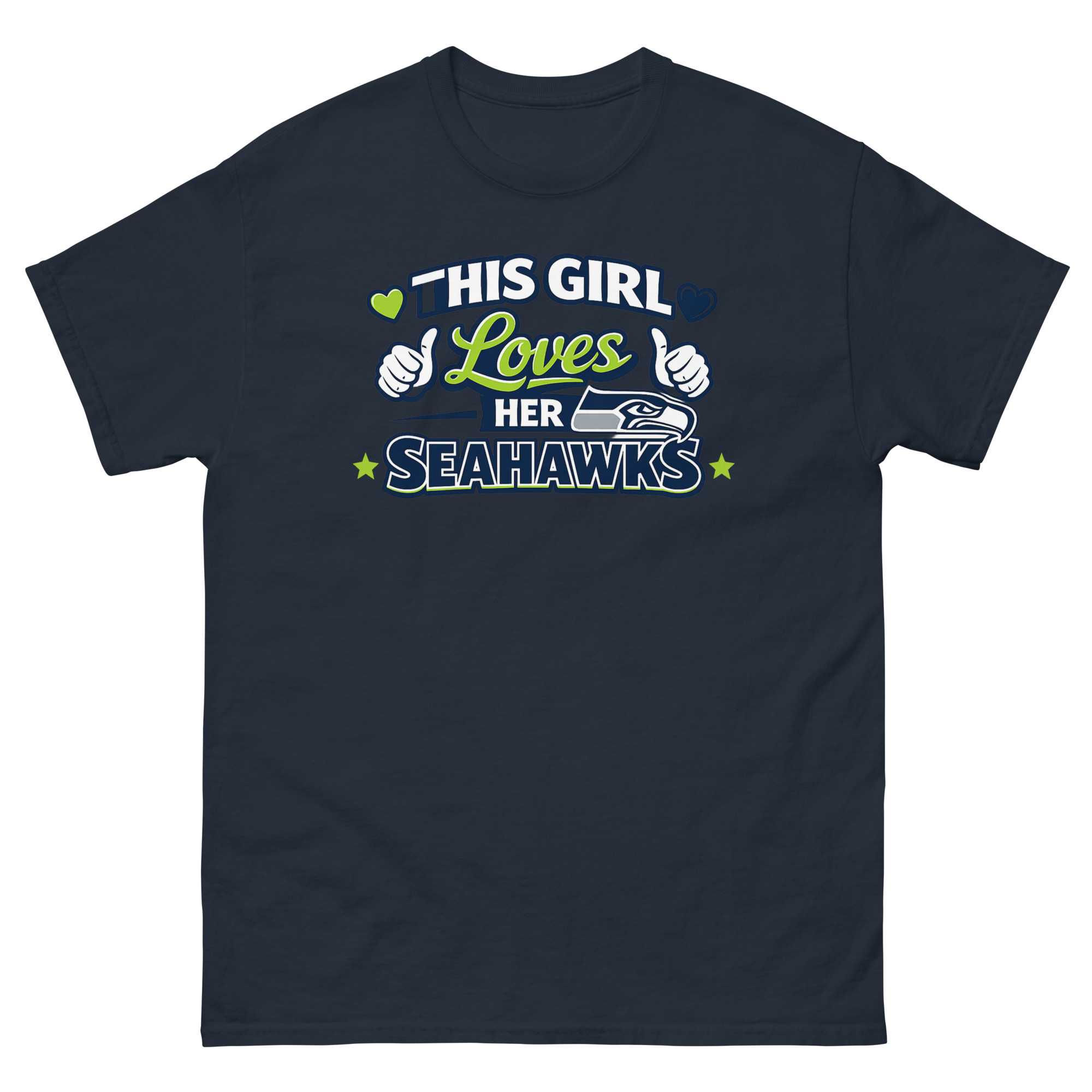 The mix of the powerful bird logo, playful thumbs-up gloves, and flowing script creates a balanced, energetic look. The bright Action Green and navy palette pops, ensuring you stand out in the crowd. This approach makes the shirt a true badge of honor for Sundays, perfect for wearing to Lumen Field, to a watch party, or as a stylish piece of Seattle football apparel every day of the week.